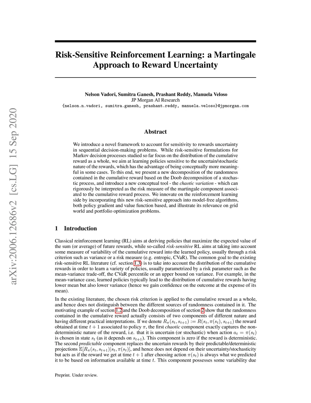 We introduce a novel framework to account for sensitivity to rewards uncertainty in sequential decision-making problems. While risk-sensitive formulations for Markov decision processes studied so far focus on the distribution of the cumulative reward as a whole, we aim at learning policies sensitive to the uncertain/stochastic nature of the rewards, which has the advantage of being conceptually more meaningful in some cases. To this end, we present a new decomposition of the randomness contained in the cumulative reward based on the Doob decomposition of a stochastic process, and introduce a new conceptual tool - the \textit{chaotic variation} - which can rigorously be interpreted as the risk measure of the martingale component associated to the cumulative reward process. We innovate on the reinforcement learning side by incorporating this new risk-sensitive approach into model-free algorithms, both policy gradient and value function based, and illustrate its relevance on grid world and portfolio optimization problems.