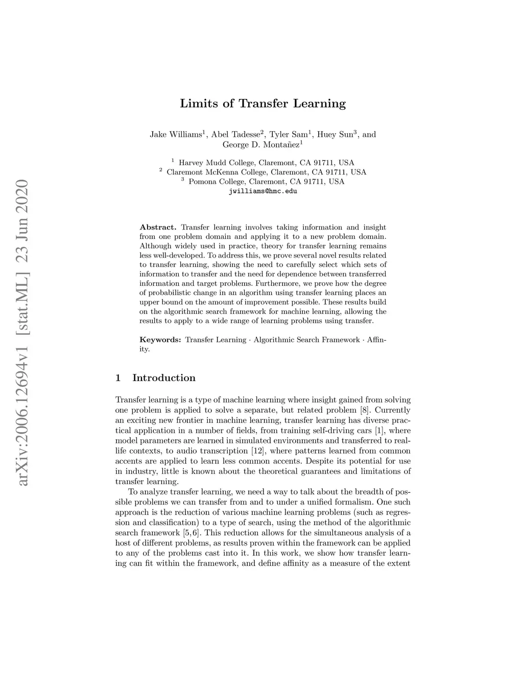 Transfer learning involves taking information and insight from one problem domain and applying it to a new problem domain. Although widely used in practice, theory for transfer learning remains less well-developed. To address this, we prove several novel results related to transfer learning, showing the need to carefully select which sets of information to transfer and the need for dependence between transferred information and target problems. Furthermore, we prove how the degree of probabilistic change in an algorithm using transfer learning places an upper bound on the amount of improvement possible. These results build on the algorithmic search framework for machine learning, allowing the results to apply to a wide range of learning problems using transfer.
