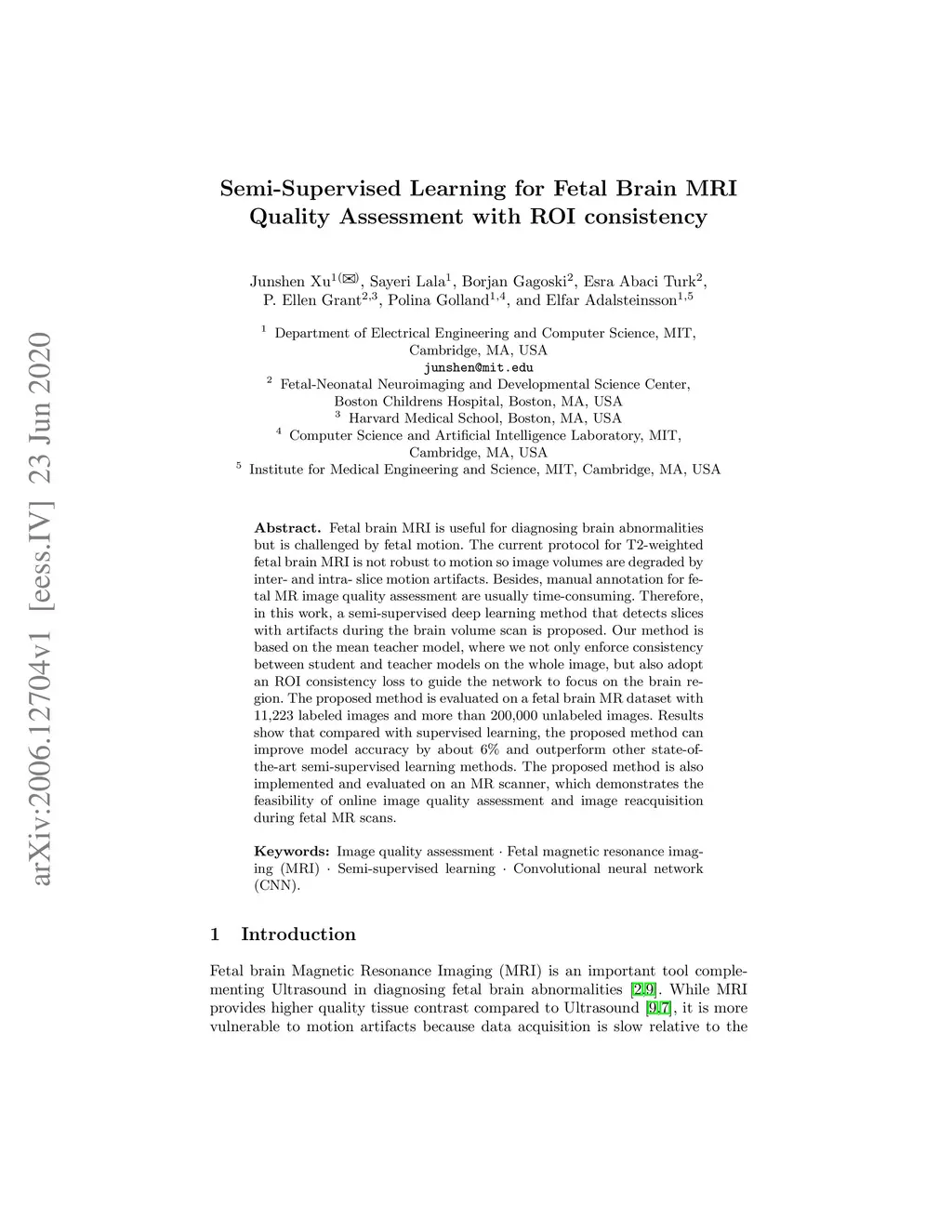 Fetal brain MRI is useful for diagnosing brain abnormalities but is challenged by fetal motion. The current protocol for T2-weighted fetal brain MRI is not robust to motion so image volumes are degraded by inter- and intra- slice motion artifacts. Besides, manual annotation for fetal MR image quality assessment are usually time-consuming. Therefore, in this work, a semi-supervised deep learning method that detects slices with artifacts during the brain volume scan is proposed. Our method is based on the mean teacher model, where we not only enforce consistency between student and teacher models on the whole image, but also adopt an ROI consistency loss to guide the network to focus on the brain region. The proposed method is evaluated on a fetal brain MR dataset with 11,223 labeled images and more than 200,000 unlabeled images. Results show that compared with supervised learning, the proposed method can improve model accuracy by about 6\% and outperform other state-of-the-art semi-supervised learning methods. The proposed method is also implemented and evaluated on an MR scanner, which demonstrates the feasibility of online image quality assessment and image reacquisition during fetal MR scans.