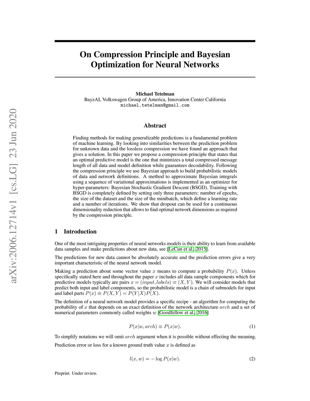 Finding methods for making generalizable predictions is a fundamental problem of machine learning. By looking into similarities between the prediction problem for unknown data and the lossless compression we have found an approach that gives a solution. In this paper we propose a compression principle that states that an optimal predictive model is the one that minimizes a total compressed message length of all data and model definition while guarantees decodability. Following the compression principle we use Bayesian approach to build probabilistic models of data and network definitions. A method to approximate Bayesian integrals using a sequence of variational approximations is implemented as an optimizer for hyper-parameters: Bayesian Stochastic Gradient Descent (BSGD). Training with BSGD is completely defined by setting only three parameters: number of epochs, the size of the dataset and the size of the minibatch, which define a learning rate and a number of iterations. We show that dropout can be used for a continuous dimensionality reduction that allows to find optimal network dimensions as required by the compression principle.
