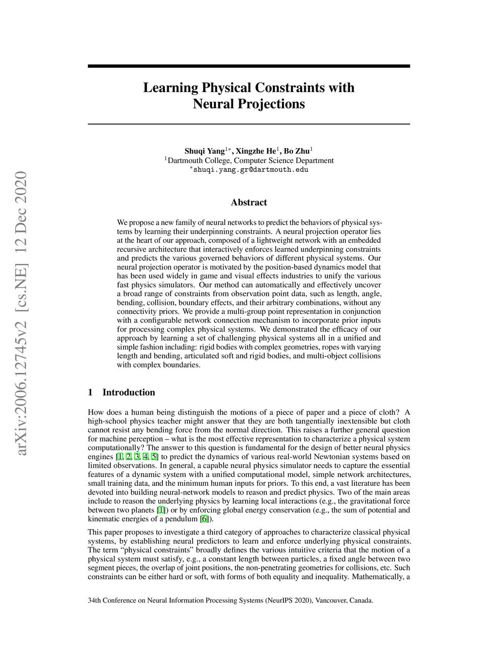 We propose a new family of neural networks to predict the behaviors of physical systems by learning their underpinning constraints. A neural projection operator lies at the heart of our approach, composed of a lightweight network with an embedded recursive architecture that interactively enforces learned underpinning constraints and predicts the various governed behaviors of different physical systems. Our neural projection operator is motivated by the position-based dynamics model that has been used widely in game and visual effects industries to unify the various fast physics simulators. Our method can automatically and effectively uncover a broad range of constraints from observation point data, such as length, angle, bending, collision, boundary effects, and their arbitrary combinations, without any connectivity priors. We provide a multi-group point representation in conjunction with a configurable network connection mechanism to incorporate prior inputs for processing complex physical systems. We demonstrated the efficacy of our approach by learning a set of challenging physical systems all in a unified and simple fashion including: rigid bodies with complex geometries, ropes with varying length and bending, articulated soft and rigid bodies, and multi-object collisions with complex boundaries.