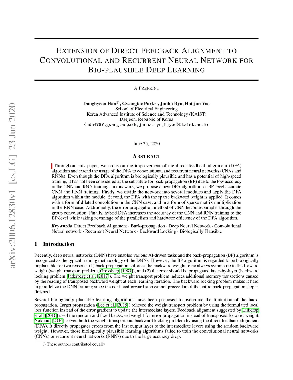 Throughout this paper, we focus on the improvement of the direct feedback alignment (DFA) algorithm and extend the usage of the DFA to convolutional and recurrent neural networks (CNNs and RNNs). Even though the DFA algorithm is biologically plausible and has a potential of high-speed training, it has not been considered as the substitute for back-propagation (BP) due to the low accuracy in the CNN and RNN training. In this work, we propose a new DFA algorithm for BP-level accurate CNN and RNN training. Firstly, we divide the network into several modules and apply the DFA algorithm within the module. Second, the DFA with the sparse backward weight is applied. It comes with a form of dilated convolution in the CNN case, and in a form of sparse matrix multiplication in the RNN case. Additionally, the error propagation method of CNN becomes simpler through the group convolution. Finally, hybrid DFA increases the accuracy of the CNN and RNN training to the BP-level while taking advantage of the parallelism and hardware efficiency of the DFA algorithm.