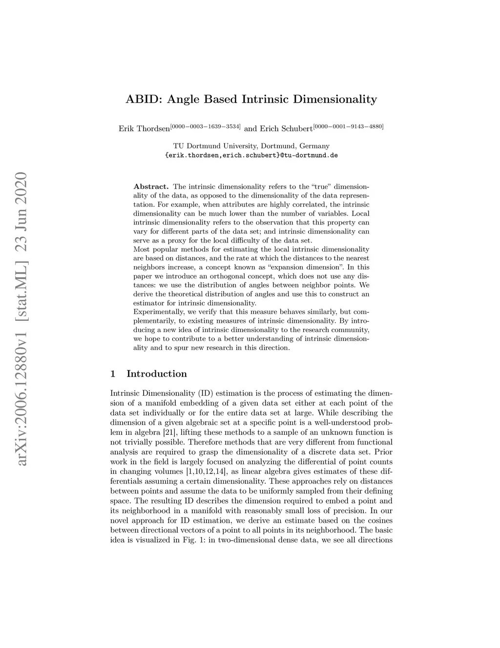 The intrinsic dimensionality refers to the ``true'' dimensionality of the data, as opposed to the dimensionality of the data representation. For example, when attributes are highly correlated, the intrinsic dimensionality can be much lower than the number of variables. Local intrinsic dimensionality refers to the observation that this property can vary for different parts of the data set; and intrinsic dimensionality can serve as a proxy for the local difficulty of the data set. Most popular methods for estimating the local intrinsic dimensionality are based on distances, and the rate at which the distances to the nearest neighbors increase, a concept known as ``expansion dimension''. In this paper we introduce an orthogonal concept, which does not use any distances: we use the distribution of angles between neighbor points. We derive the theoretical distribution of angles and use this to construct an estimator for intrinsic dimensionality. Experimentally, we verify that this measure behaves similarly, but complementarily, to existing measures of intrinsic dimensionality. By introducing a new idea of intrinsic dimensionality to the research community, we hope to contribute to a better understanding of intrinsic dimensionality and to spur new research in this direction.