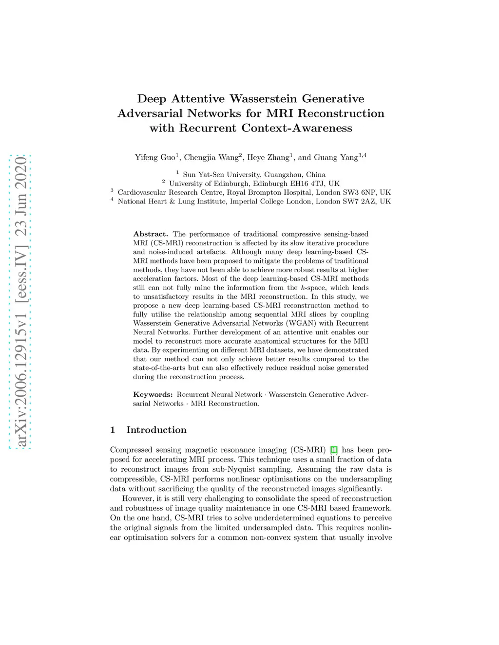 The performance of traditional compressive sensing-based MRI (CS-MRI) reconstruction is affected by its slow iterative procedure and noise-induced artefacts. Although many deep learning-based CS-MRI methods have been proposed to mitigate the problems of traditional methods, they have not been able to achieve more robust results at higher acceleration factors. Most of the deep learning-based CS-MRI methods still can not fully mine the information from the k-space, which leads to unsatisfactory results in the MRI reconstruction. In this study, we propose a new deep learning-based CS-MRI reconstruction method to fully utilise the relationship among sequential MRI slices by coupling Wasserstein Generative Adversarial Networks (WGAN) with Recurrent Neural Networks. Further development of an attentive unit enables our model to reconstruct more accurate anatomical structures for the MRI data. By experimenting on different MRI datasets, we have demonstrated that our method can not only achieve better results compared to the state-of-the-arts but can also effectively reduce residual noise generated during the reconstruction process.
