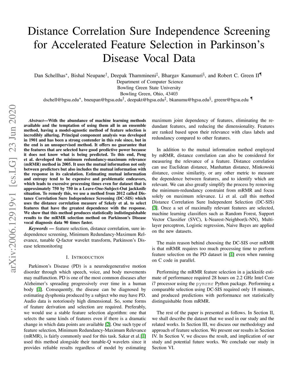 With the abundance of machine learning methods available and the temptation of using them all in an ensemble method, having a model-agnostic method of feature selection is incredibly alluring. Principal component analysis was developed in 1901 and has been a strong contender in this role since, but in the end is an unsupervised method. It offers no guarantee that the features that are selected have good predictive power because it does not know what is being predicted. To this end, Peng et al. developed the minimum redundancy-maximum relevance (mRMR) method in 2005. It uses the mutual information not only between predictors but also includes the mutual information with the response in its calculation. Estimating mutual information and entropy tend to be expensive and problematic endeavors, which leads to excessive processing times even for dataset that is approximately 750 by 750 in a Leave-One-Subject-Out jackknife situation. To remedy this, we use a method from 2012 called Distance Correlation Sure Independence Screening (DC-SIS) which uses the distance correlation measure of Sz\ékely et al. to select features that have the greatest dependence with the response. We show that this method produces statistically indistinguishable results to the mRMR selection method on Parkinson's Disease vocal diagnosis data 90 times faster.