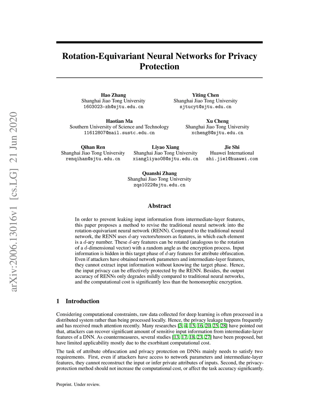 In order to prevent leaking input information from intermediate-layer features, this paper proposes a method to revise the traditional neural network into the rotation-equivariant neural network (RENN). Compared to the traditional neural network, the RENN uses d-ary vectors/tensors as features, in which each element is a d-ary number. These d-ary features can be rotated (analogous to the rotation of a d-dimensional vector) with a random angle as the encryption process. Input information is hidden in this target phase of d-ary features for attribute obfuscation. Even if attackers have obtained network parameters and intermediate-layer features, they cannot extract input information without knowing the target phase. Hence, the input privacy can be effectively protected by the RENN. Besides, the output accuracy of RENNs only degrades mildly compared to traditional neural networks, and the computational cost is significantly less than the homomorphic encryption.