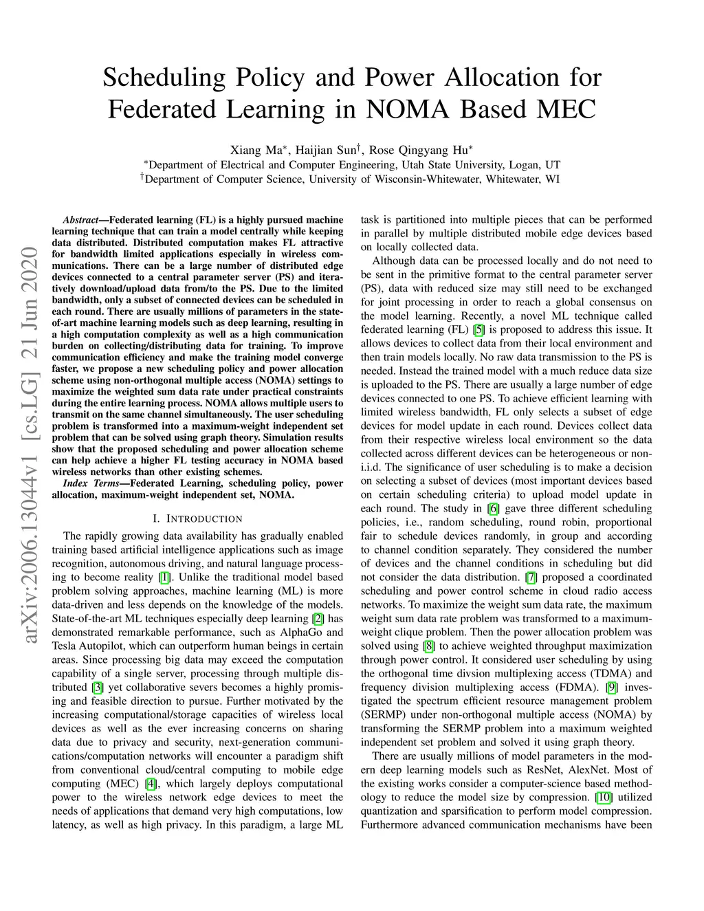 Federated learning (FL) is a highly pursued machine learning technique that can train a model centrally while keeping data distributed. Distributed computation makes FL attractive for bandwidth limited applications especially in wireless communications. There can be a large number of distributed edge devices connected to a central parameter server (PS) and iteratively download/upload data from/to the PS. Due to the limited bandwidth, only a subset of connected devices can be scheduled in each round. There are usually millions of parameters in the state-of-art machine learning models such as deep learning, resulting in a high computation complexity as well as a high communication burden on collecting/distributing data for training. To improve communication efficiency and make the training model converge faster, we propose a new scheduling policy and power allocation scheme using non-orthogonal multiple access (NOMA) settings to maximize the weighted sum data rate under practical constraints during the entire learning process. NOMA allows multiple users to transmit on the same channel simultaneously. The user scheduling problem is transformed into a maximum-weight independent set problem that can be solved using graph theory. Simulation results show that the proposed scheduling and power allocation scheme can help achieve a higher FL testing accuracy in NOMA based wireless networks than other existing schemes.