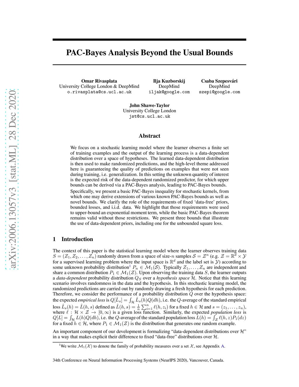 We focus on a stochastic learning model where the learner observes a finite set of training examples and the output of the learning process is a data-dependent distribution over a space of hypotheses. The learned data-dependent distribution is then used to make randomized predictions, and the high-level theme addressed here is guaranteeing the quality of predictions on examples that were not seen during training, i.e. generalization. In this setting the unknown quantity of interest is the expected risk of the data-dependent randomized predictor, for which upper bounds can be derived via a PAC-Bayes analysis, leading to PAC-Bayes bounds. Specifically, we present a basic PAC-Bayes inequality for stochastic kernels, from which one may derive extensions of various known PAC-Bayes bounds as well as novel bounds. We clarify the role of the requirements of fixed 'data-free' priors, bounded losses, and i.i.d. data. We highlight that those requirements were used to upper-bound an exponential moment term, while the basic PAC-Bayes theorem remains valid without those restrictions. We present three bounds that illustrate the use of data-dependent priors, including one for the unbounded square loss.