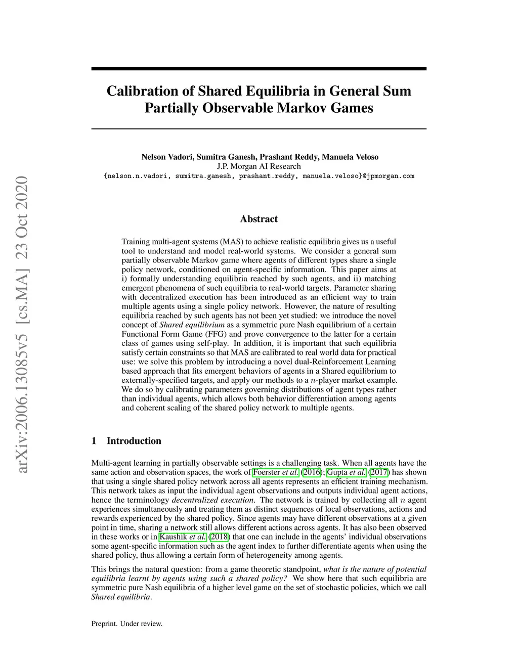 Training multi-agent systems (MAS) to achieve realistic equilibria gives us a useful tool to understand and model real-world systems. We consider a general sum partially observable Markov game where agents of different types share a single policy network, conditioned on agent-specific information. This paper aims at i) formally understanding equilibria reached by such agents, and ii) matching emergent phenomena of such equilibria to real-world targets. Parameter sharing with decentralized execution has been introduced as an efficient way to train multiple agents using a single policy network. However, the nature of resulting equilibria reached by such agents has not been yet studied: we introduce the novel concept of Shared equilibrium as a symmetric pure Nash equilibrium of a certain Functional Form Game (FFG) and prove convergence to the latter for a certain class of games using self-play. In addition, it is important that such equilibria satisfy certain constraints so that MAS are calibrated to real world data for practical use: we solve this problem by introducing a novel dual-Reinforcement Learning based approach that fits emergent behaviors of agents in a Shared equilibrium to externally-specified targets, and apply our methods to a n-player market example. We do so by calibrating parameters governing distributions of agent types rather than individual agents, which allows both behavior differentiation among agents and coherent scaling of the shared policy network to multiple agents.