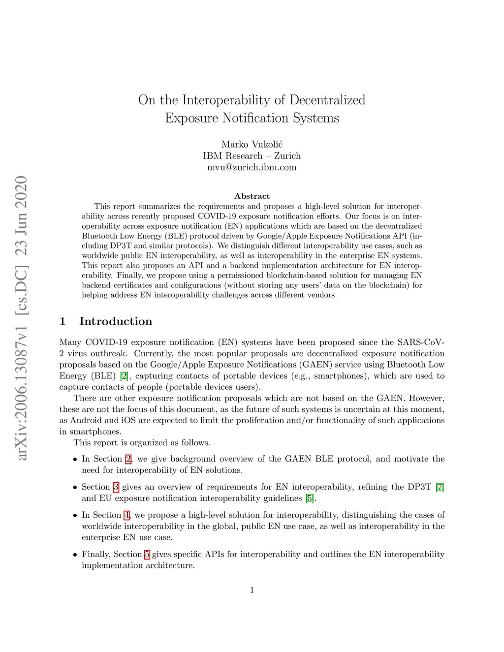 This report summarizes the requirements and proposes a high-level solution for interoperability across recently proposed COVID-19 exposure notification efforts. Our focus is on interoperability across exposure notification (EN) applications which are based on the decentralized Bluetooth Low Energy (BLE) protocol driven by Google/Apple Exposure Notifications API (including DP3T and similar protocols). We distinguish different interoperability use cases, such as worldwide public EN interoperability, as well as interoperability in the enterprise EN systems. This report also proposes an API and a backend implementation architecture for EN interoperability. Finally, we propose using a permissioned blockchain-based solution for managing EN backend certificates and configurations (without storing any users' data on the blockchain) for helping address EN interoperability challenges across different vendors.