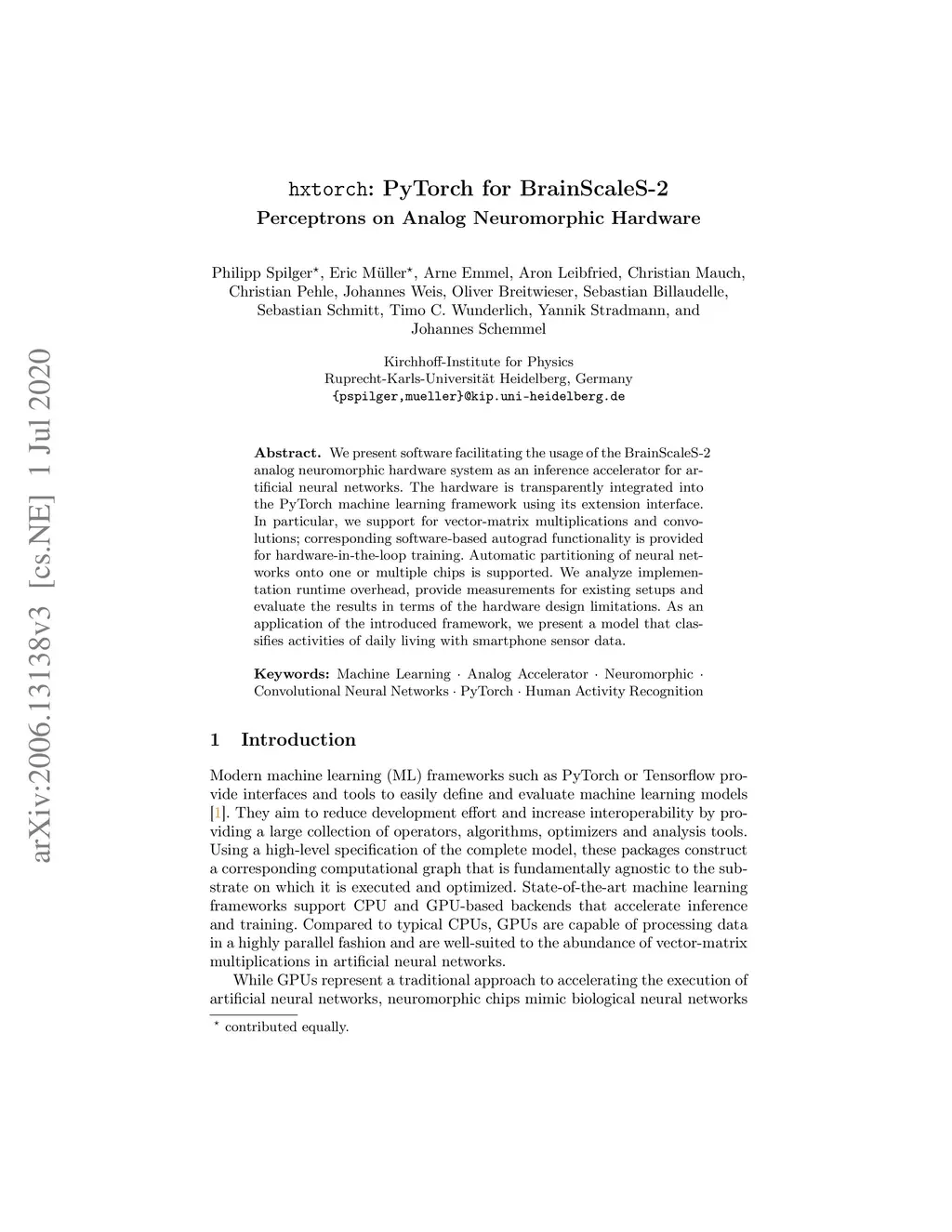 We present software facilitating the usage of the BrainScaleS-2 analog neuromorphic hardware system as an inference accelerator for artificial neural networks. The accelerator hardware is transparently integrated into the PyTorch machine learning framework using its extension interface. In particular, we provide accelerator support for vector-matrix multiplications and convolutions; corresponding software-based autograd functionality is provided for hardware-in-the-loop training. Automatic partitioning of neural networks onto one or multiple accelerator chips is supported. We analyze implementation runtime overhead during training as well as inference, provide measurements for existing setups and evaluate the results in terms of the accelerator hardware design limitations. As an application of the introduced framework, we present a model that classifies activities of daily living with smartphone sensor data.