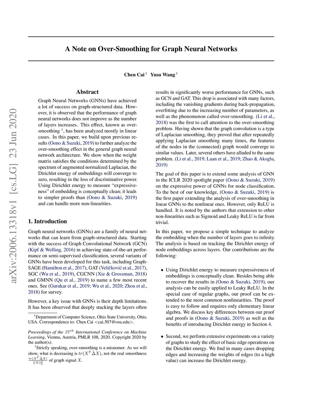 Graph Neural Networks (GNNs) have achieved a lot of success on graph-structured data. However, it is observed that the performance of graph neural networks does not improve as the number of layers increases. This effect, known as over-smoothing, has been analyzed mostly in linear cases. In this paper, we build upon previous results \cite{oono2019graph} to further analyze the over-smoothing effect in the general graph neural network architecture. We show when the weight matrix satisfies the conditions determined by the spectrum of augmented normalized Laplacian, the Dirichlet energy of embeddings will converge to zero, resulting in the loss of discriminative power. Using Dirichlet energy to measure "expressiveness" of embedding is conceptually clean; it leads to simpler proofs than \cite{oono2019graph} and can handle more non-linearities.