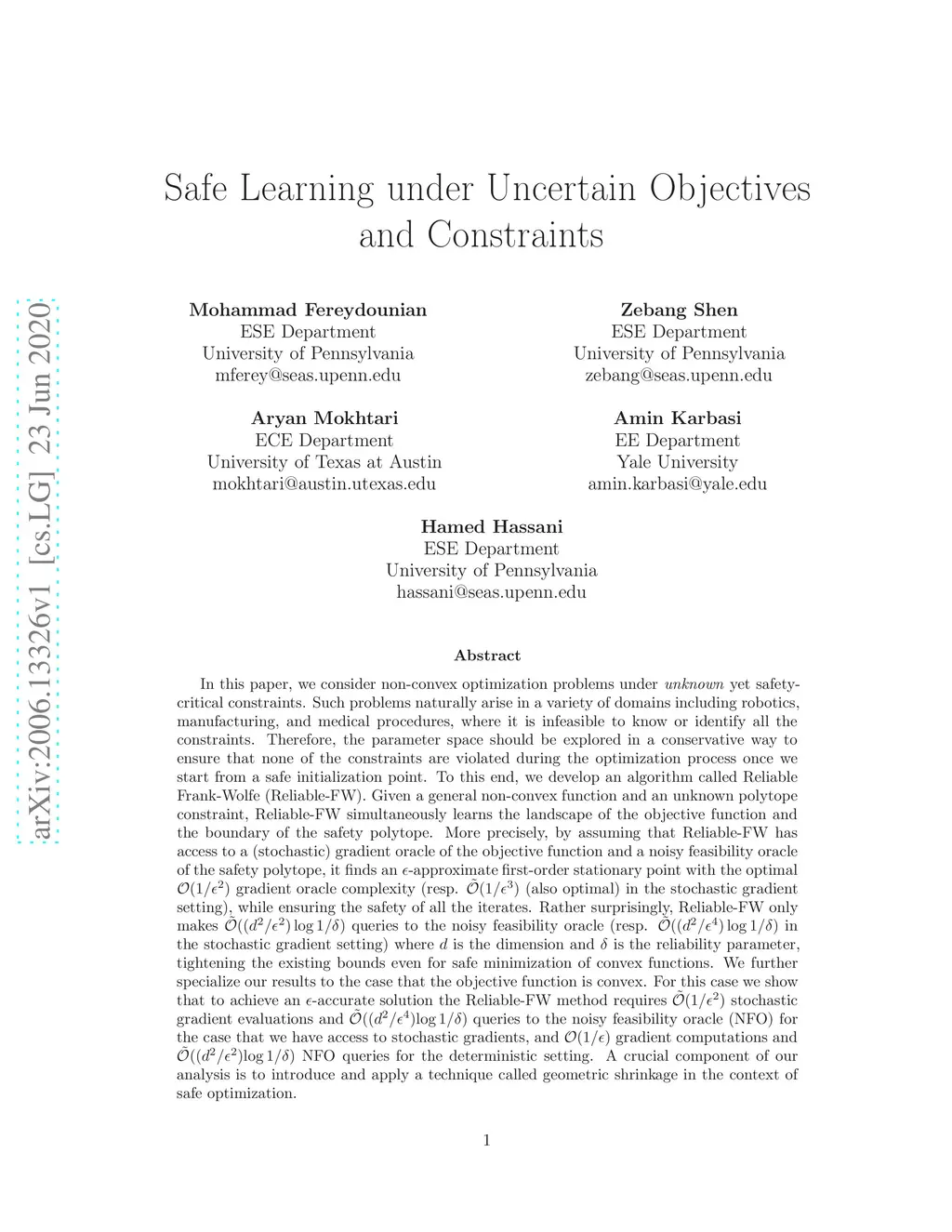 In this paper, we consider non-convex optimization problems under \textit{unknown} yet safety-critical constraints. Such problems naturally arise in a variety of domains including robotics, manufacturing, and medical procedures, where it is infeasible to know or identify all the constraints. Therefore, the parameter space should be explored in a conservative way to ensure that none of the constraints are violated during the optimization process once we start from a safe initialization point. To this end, we develop an algorithm called Reliable Frank-Wolfe (Reliable-FW). Given a general non-convex function and an unknown polytope constraint, Reliable-FW simultaneously learns the landscape of the objective function and the boundary of the safety polytope. More precisely, by assuming that Reliable-FW has access to a (stochastic) gradient oracle of the objective function and a noisy feasibility oracle of the safety polytope, it finds an -approximate first-order stationary point with the optimal gradient oracle complexity (resp. (also optimal) in the stochastic gradient setting), while ensuring the safety of all the iterates. Rather surprisingly, Reliable-FW only makes queries to the noisy feasibility oracle (resp. in the stochastic gradient setting) where is the dimension and is the reliability parameter, tightening the existing bounds even for safe minimization of convex functions. We further specialize our results to the case that the objective function is convex. A crucial component of our analysis is to introduce and apply a technique called geometric shrinkage in the context of safe optimization.