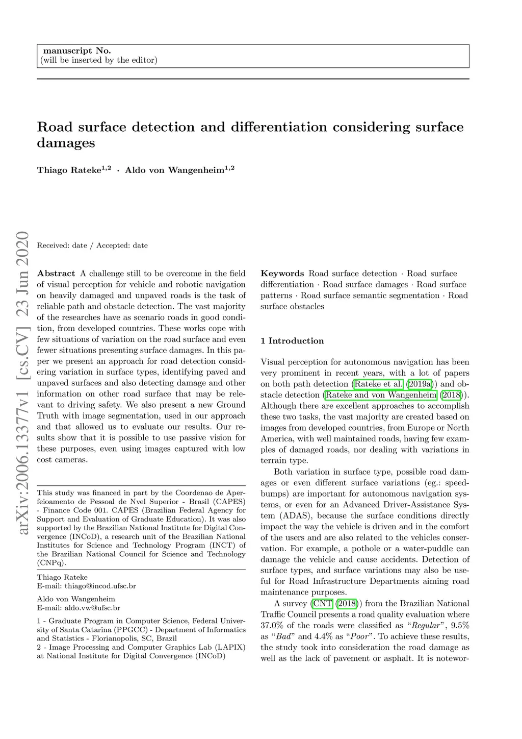 A challenge still to be overcome in the field of visual perception for vehicle and robotic navigation on heavily damaged and unpaved roads is the task of reliable path and obstacle detection. The vast majority of the researches have as scenario roads in good condition, from developed countries. These works cope with few situations of variation on the road surface and even fewer situations presenting surface damages. In this paper we present an approach for road detection considering variation in surface types, identifying paved and unpaved surfaces and also detecting damage and other information on other road surface that may be relevant to driving safety. We also present a new Ground Truth with image segmentation, used in our approach and that allowed us to evaluate our results. Our results show that it is possible to use passive vision for these purposes, even using images captured with low cost cameras.