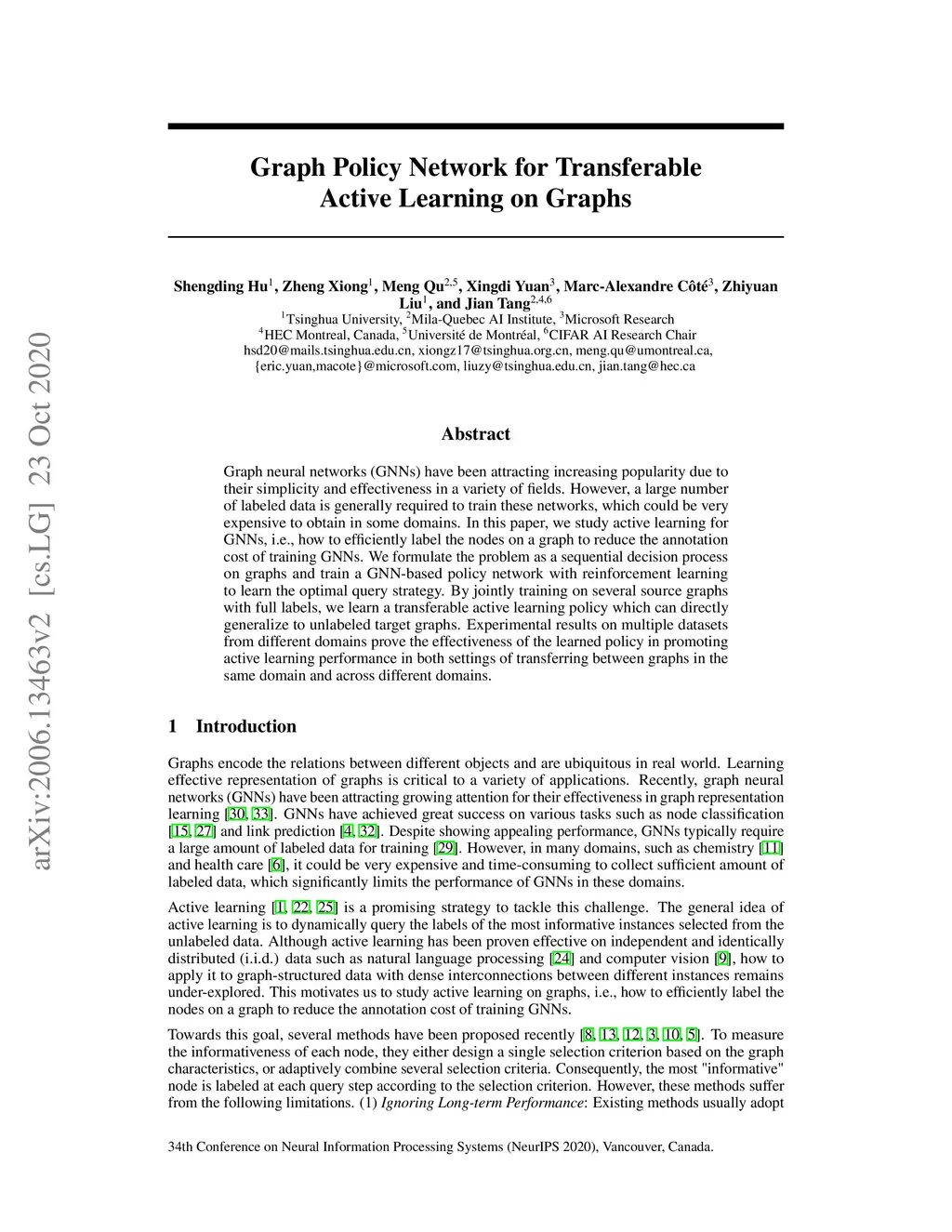 Graph neural networks (GNNs) have been attracting increasing popularity due to their simplicity and effectiveness in a variety of fields. However, a large number of labeled data is generally required to train these networks, which could be very expensive to obtain in some domains. In this paper, we study active learning for GNNs, i.e., how to efficiently label the nodes on a graph to reduce the annotation cost of training GNNs. We formulate the problem as a sequential decision process on graphs and train a GNN-based policy network with reinforcement learning to learn the optimal query strategy. By jointly training on several source graphs with full labels, we learn a transferable active learning policy which can directly generalize to unlabeled target graphs. Experimental results on multiple datasets from different domains prove the effectiveness of the learned policy in promoting active learning performance in both settings of transferring between graphs in the same domain and across different domains.
