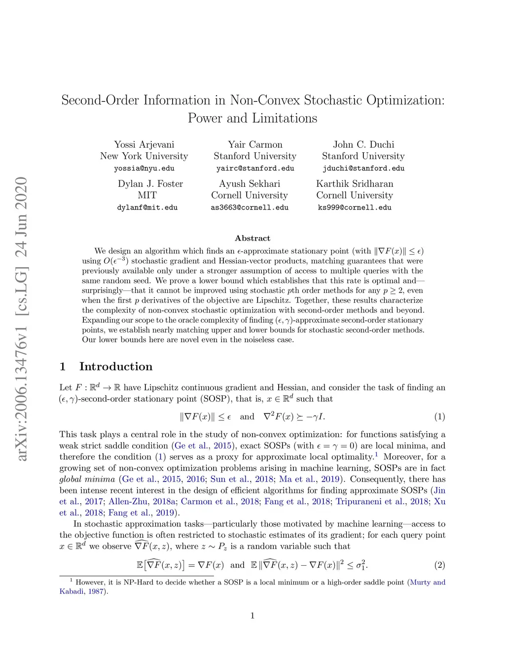 We design an algorithm which finds an -approximate stationary point (with ) using stochastic gradient and Hessian-vector products, matching guarantees that were previously available only under a stronger assumption of access to multiple queries with the same random seed. We prove a lower bound which establishes that this rate is optimal and---surprisingly---that it cannot be improved using stochastic th order methods for any , even when the first derivatives of the objective are Lipschitz. Together, these results characterize the complexity of non-convex stochastic optimization with second-order methods and beyond. Expanding our scope to the oracle complexity of finding -approximate second-order stationary points, we establish nearly matching upper and lower bounds for stochastic second-order methods. Our lower bounds here are novel even in the noiseless case.