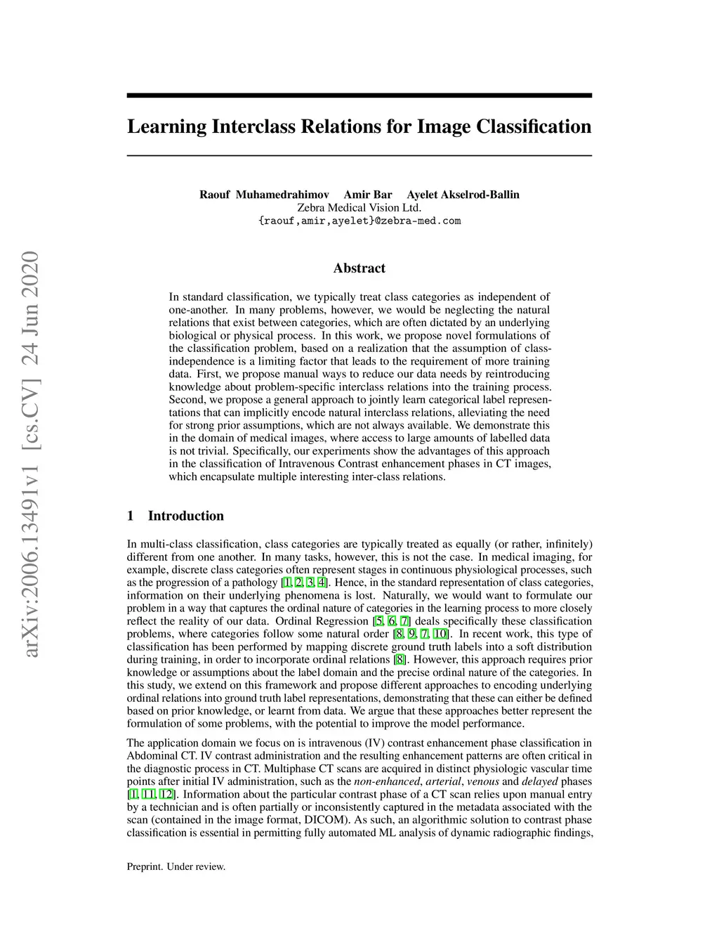 In standard classification, we typically treat class categories as independent of one-another. In many problems, however, we would be neglecting the natural relations that exist between categories, which are often dictated by an underlying biological or physical process. In this work, we propose novel formulations of the classification problem, based on a realization that the assumption of class-independence is a limiting factor that leads to the requirement of more training data. First, we propose manual ways to reduce our data needs by reintroducing knowledge about problem-specific interclass relations into the training process. Second, we propose a general approach to jointly learn categorical label representations that can implicitly encode natural interclass relations, alleviating the need for strong prior assumptions, which are not always available. We demonstrate this in the domain of medical images, where access to large amounts of labelled data is not trivial. Specifically, our experiments show the advantages of this approach in the classification of Intravenous Contrast enhancement phases in CT images, which encapsulate multiple interesting inter-class relations.