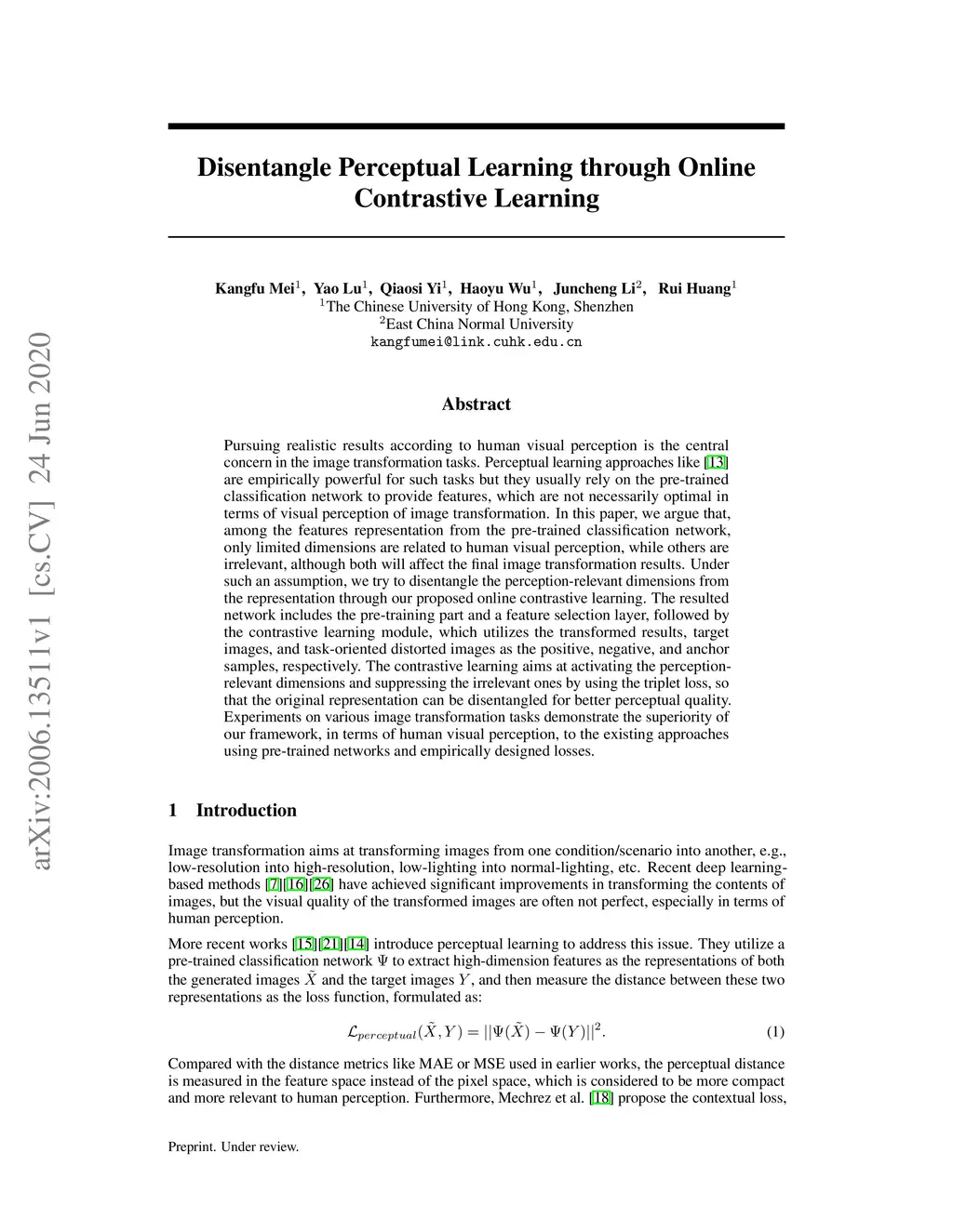 Disentangle Perceptual Learning through Online Contrastive Learning