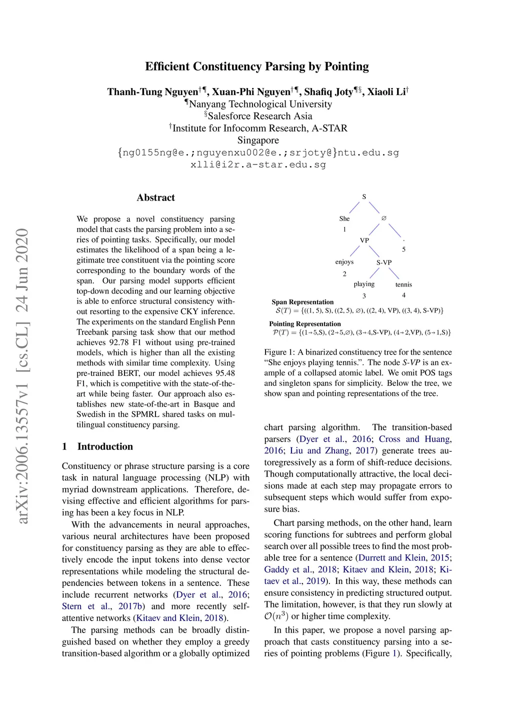 We propose a novel constituency parsing model that casts the parsing problem into a series of pointing tasks. Specifically, our model estimates the likelihood of a span being a legitimate tree constituent via the pointing score corresponding to the boundary words of the span. Our parsing model supports efficient top-down decoding and our learning objective is able to enforce structural consistency without resorting to the expensive CKY inference. The experiments on the standard English Penn Treebank parsing task show that our method achieves 92.78 F1 without using pre-trained models, which is higher than all the existing methods with similar time complexity. Using pre-trained BERT, our model achieves 95.48 F1, which is competitive with the state-of-the-art while being faster. Our approach also establishes new state-of-the-art in Basque and Swedish in the SPMRL shared tasks on multilingual constituency parsing.
