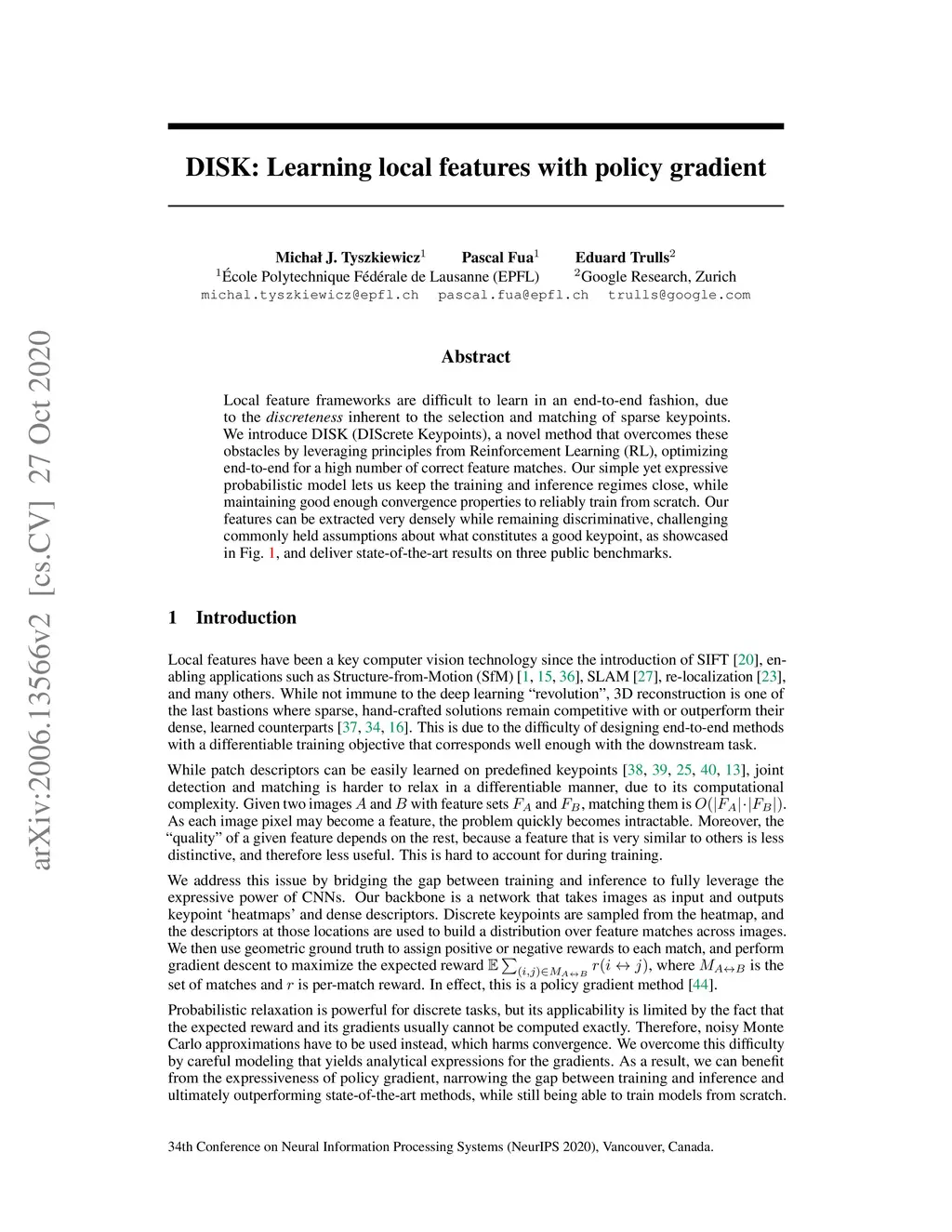Local feature frameworks are difficult to learn in an end-to-end fashion, due to the discreteness inherent to the selection and matching of sparse keypoints. We introduce DISK (DIScrete Keypoints), a novel method that overcomes these obstacles by leveraging principles from Reinforcement Learning (RL), optimizing end-to-end for a high number of correct feature matches. Our simple yet expressive probabilistic model lets us keep the training and inference regimes close, while maintaining good enough convergence properties to reliably train from scratch. Our features can be extracted very densely while remaining discriminative, challenging commonly held assumptions about what constitutes a good keypoint, as showcased in Fig. 1, and deliver state-of-the-art results on three public benchmarks.