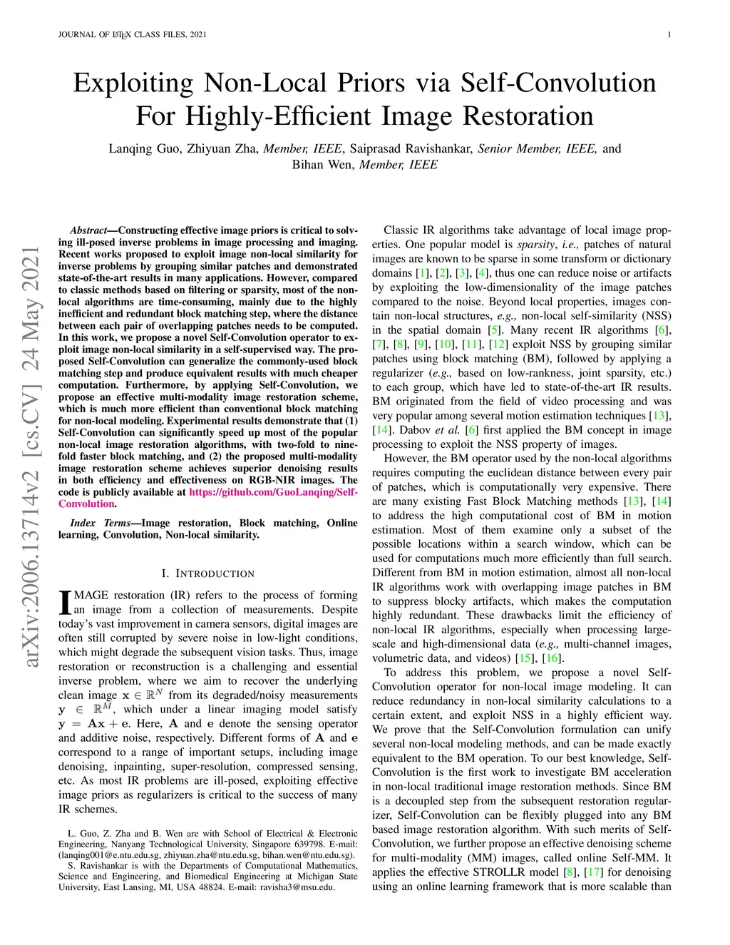 Constructing effective image priors is critical to solving ill-posed inverse problems in image processing and imaging. Recent works proposed to exploit image non-local similarity for inverse problems by grouping similar patches and demonstrated state-of-the-art results in many applications. However, compared to classic methods based on filtering or sparsity, most of the non-local algorithms are time-consuming, mainly due to the highly inefficient and redundant block matching step, where the distance between each pair of overlapping patches needs to be computed. In this work, we propose a novel Self-Convolution operator to exploit image non-local similarity in a self-supervised way. The proposed Self-Convolution can generalize the commonly-used block matching step and produce equivalent results with much cheaper computation. Furthermore, by applying Self-Convolution, we propose an effective multi-modality image restoration scheme, which is much more efficient than conventional block matching for non-local modeling. Experimental results demonstrate that (1) Self-Convolution can significantly speed up most of the popular non-local image restoration algorithms, with two-fold to nine-fold faster block matching, and (2) the proposed multi-modality image restoration scheme achieves superior denoising results in both efficiency and effectiveness on RGB-NIR images. The code is publicly available at \href{https://github.com/GuoLanqing/Self-Convolution}.