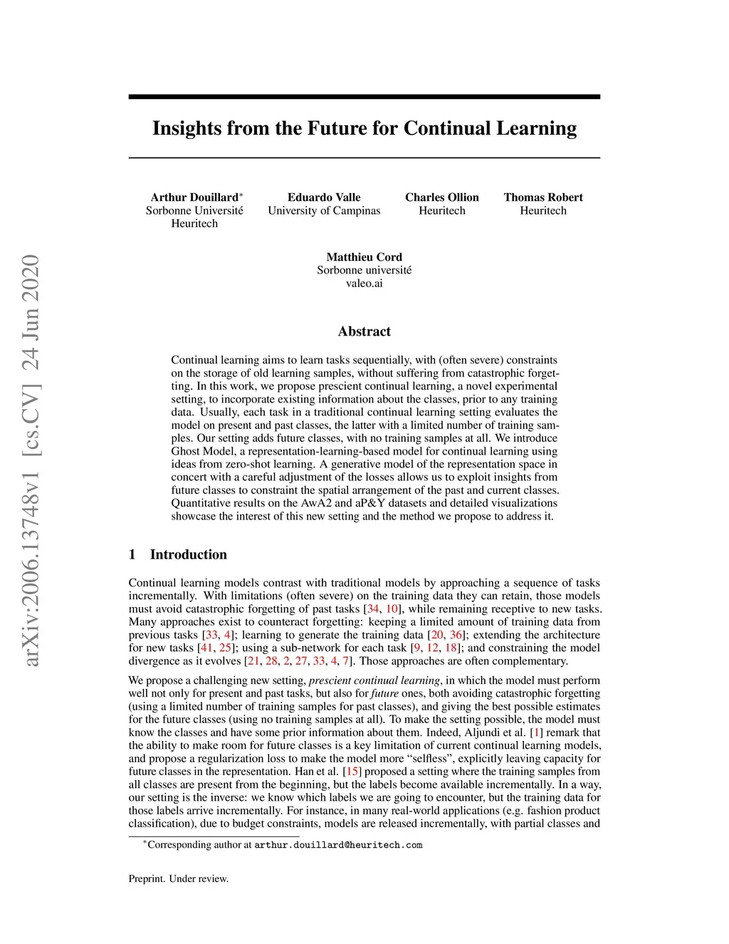 Continual learning aims to learn tasks sequentially, with (often severe) constraints on the storage of old learning samples, without suffering from catastrophic forgetting. In this work, we propose prescient continual learning, a novel experimental setting, to incorporate existing information about the classes, prior to any training data. Usually, each task in a traditional continual learning setting evaluates the model on present and past classes, the latter with a limited number of training samples. Our setting adds future classes, with no training samples at all. We introduce Ghost Model, a representation-learning-based model for continual learning using ideas from zero-shot learning. A generative model of the representation space in concert with a careful adjustment of the losses allows us to exploit insights from future classes to constraint the spatial arrangement of the past and current classes. Quantitative results on the AwA2 and aP\&Y datasets and detailed visualizations showcase the interest of this new setting and the method we propose to address it.