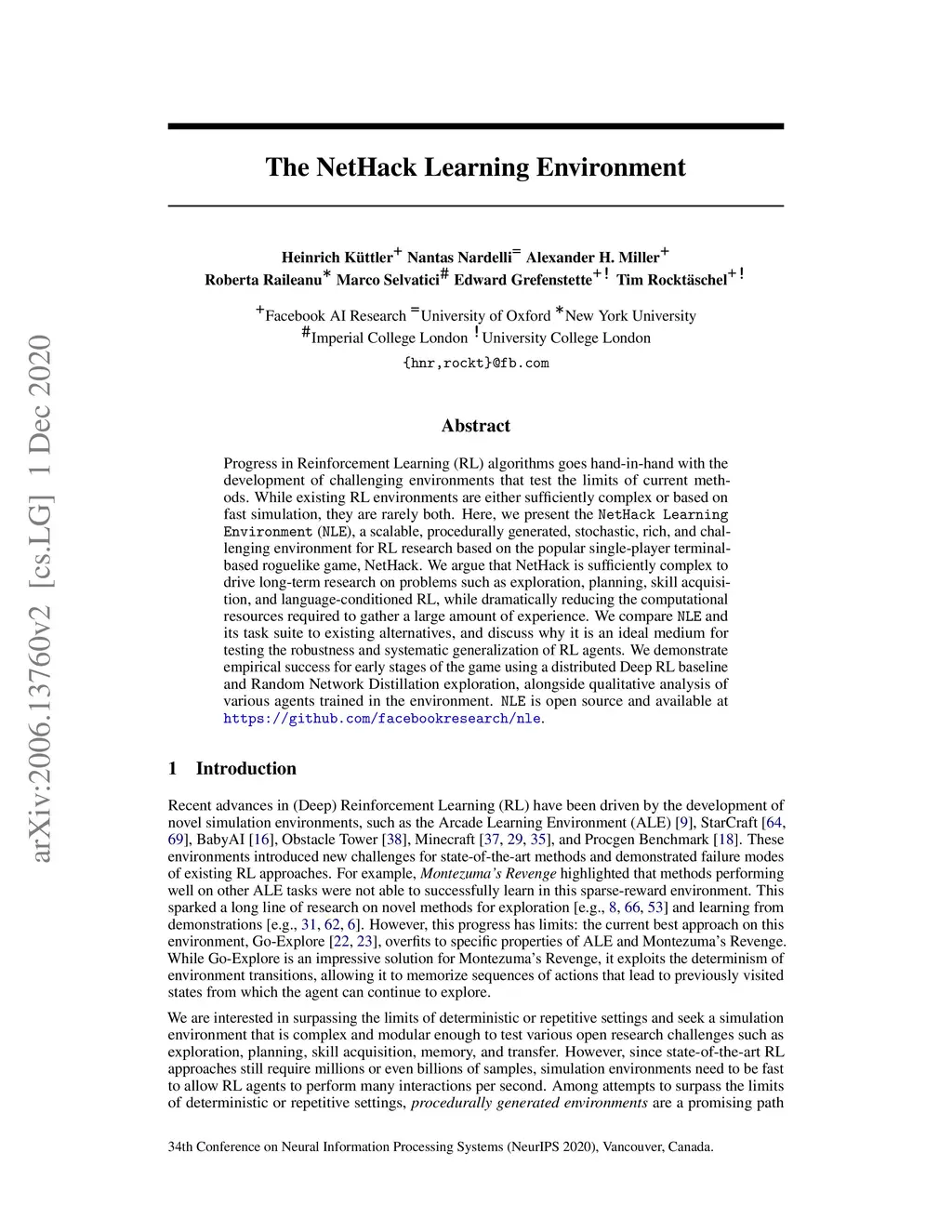 Progress in Reinforcement Learning (RL) algorithms goes hand-in-hand with the development of challenging environments that test the limits of current methods. While existing RL environments are either sufficiently complex or based on fast simulation, they are rarely both. Here, we present the NetHack Learning Environment (NLE), a scalable, procedurally generated, stochastic, rich, and challenging environment for RL research based on the popular single-player terminal-based roguelike game, NetHack. We argue that NetHack is sufficiently complex to drive long-term research on problems such as exploration, planning, skill acquisition, and language-conditioned RL, while dramatically reducing the computational resources required to gather a large amount of experience. We compare NLE and its task suite to existing alternatives, and discuss why it is an ideal medium for testing the robustness and systematic generalization of RL agents. We demonstrate empirical success for early stages of the game using a distributed Deep RL baseline and Random Network Distillation exploration, alongside qualitative analysis of various agents trained in the environment. NLE is open source at https://github.com/facebookresearch/nle.