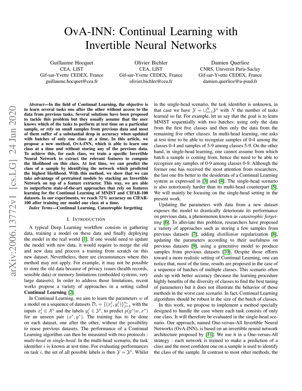 In the field of Continual Learning, the objective is to learn several tasks one after the other without access to the data from previous tasks. Several solutions have been proposed to tackle this problem but they usually assume that the user knows which of the tasks to perform at test time on a particular sample, or rely on small samples from previous data and most of them suffer of a substantial drop in accuracy when updated with batches of only one class at a time. In this article, we propose a new method, OvA-INN, which is able to learn one class at a time and without storing any of the previous data. To achieve this, for each class, we train a specific Invertible Neural Network to extract the relevant features to compute the likelihood on this class. At test time, we can predict the class of a sample by identifying the network which predicted the highest likelihood. With this method, we show that we can take advantage of pretrained models by stacking an Invertible Network on top of a feature extractor. This way, we are able to outperform state-of-the-art approaches that rely on features learning for the Continual Learning of MNIST and CIFAR-100 datasets. In our experiments, we reach 72% accuracy on CIFAR-100 after training our model one class at a time.