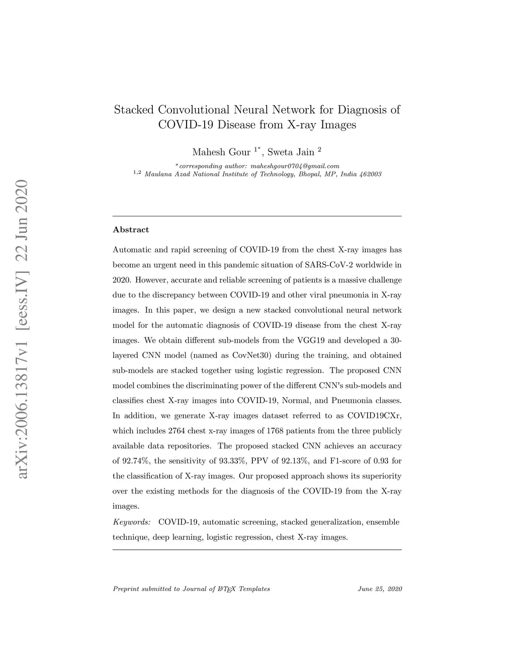 Automatic and rapid screening of COVID-19 from the chest X-ray images has become an urgent need in this pandemic situation of SARS-CoV-2 worldwide in 2020. However, accurate and reliable screening of patients is a massive challenge due to the discrepancy between COVID-19 and other viral pneumonia in X-ray images. In this paper, we design a new stacked convolutional neural network model for the automatic diagnosis of COVID-19 disease from the chest X-ray images. We obtain different sub-models from the VGG19 and developed a 30-layered CNN model (named as CovNet30) during the training, and obtained sub-models are stacked together using logistic regression. The proposed CNN model combines the discriminating power of the different CNN`s sub-models and classifies chest X-ray images into COVID-19, Normal, and Pneumonia classes. In addition, we generate X-ray images dataset referred to as COVID19CXr, which includes 2764 chest x-ray images of 1768 patients from the three publicly available data repositories. The proposed stacked CNN achieves an accuracy of 92.74%, the sensitivity of 93.33%, PPV of 92.13%, and F1-score of 0.93 for the classification of X-ray images. Our proposed approach shows its superiority over the existing methods for the diagnosis of the COVID-19 from the X-ray images.