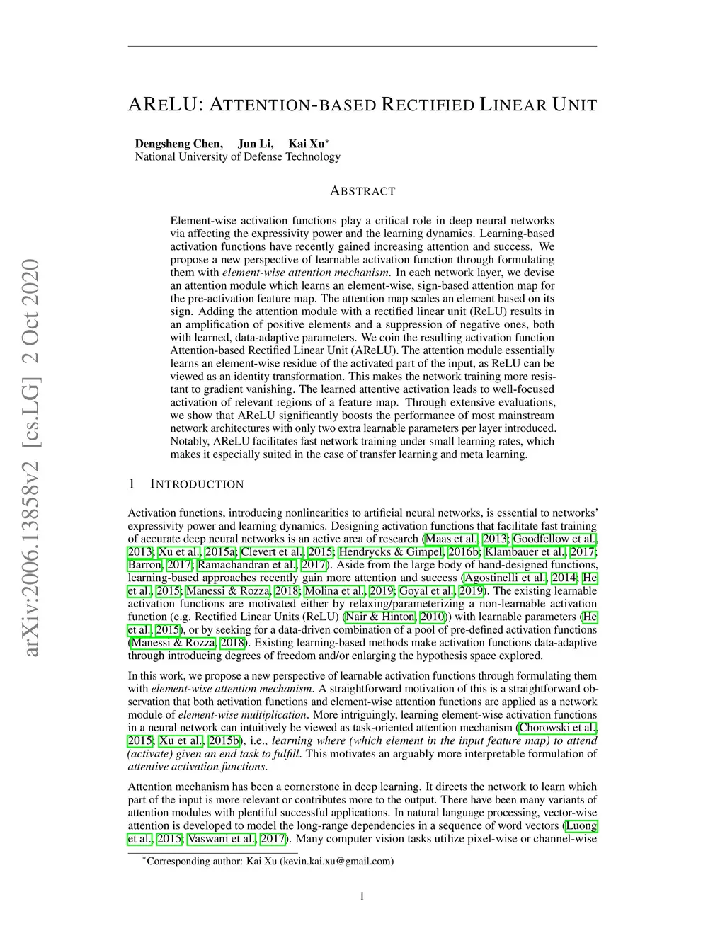 Element-wise activation functions play a critical role in deep neural networks via affecting the expressivity power and the learning dynamics. Learning-based activation functions have recently gained increasing attention and success. We propose a new perspective of learnable activation function through formulating them with element-wise attention mechanism. In each network layer, we devise an attention module which learns an element-wise, sign-based attention map for the pre-activation feature map. The attention map scales an element based on its sign. Adding the attention module with a rectified linear unit (ReLU) results in an amplification of positive elements and a suppression of negative ones, both with learned, data-adaptive parameters. We coin the resulting activation function Attention-based Rectified Linear Unit (AReLU). The attention module essentially learns an element-wise residue of the activated part of the input, as ReLU can be viewed as an identity transformation. This makes the network training more resistant to gradient vanishing. The learned attentive activation leads to well-focused activation of relevant regions of a feature map. Through extensive evaluations, we show that AReLU significantly boosts the performance of most mainstream network architectures with only two extra learnable parameters per layer introduced. Notably, AReLU facilitates fast network training under small learning rates, which makes it especially suited in the case of transfer learning and meta learning. Our source code has been released (see https://github.com/densechen/AReLU).