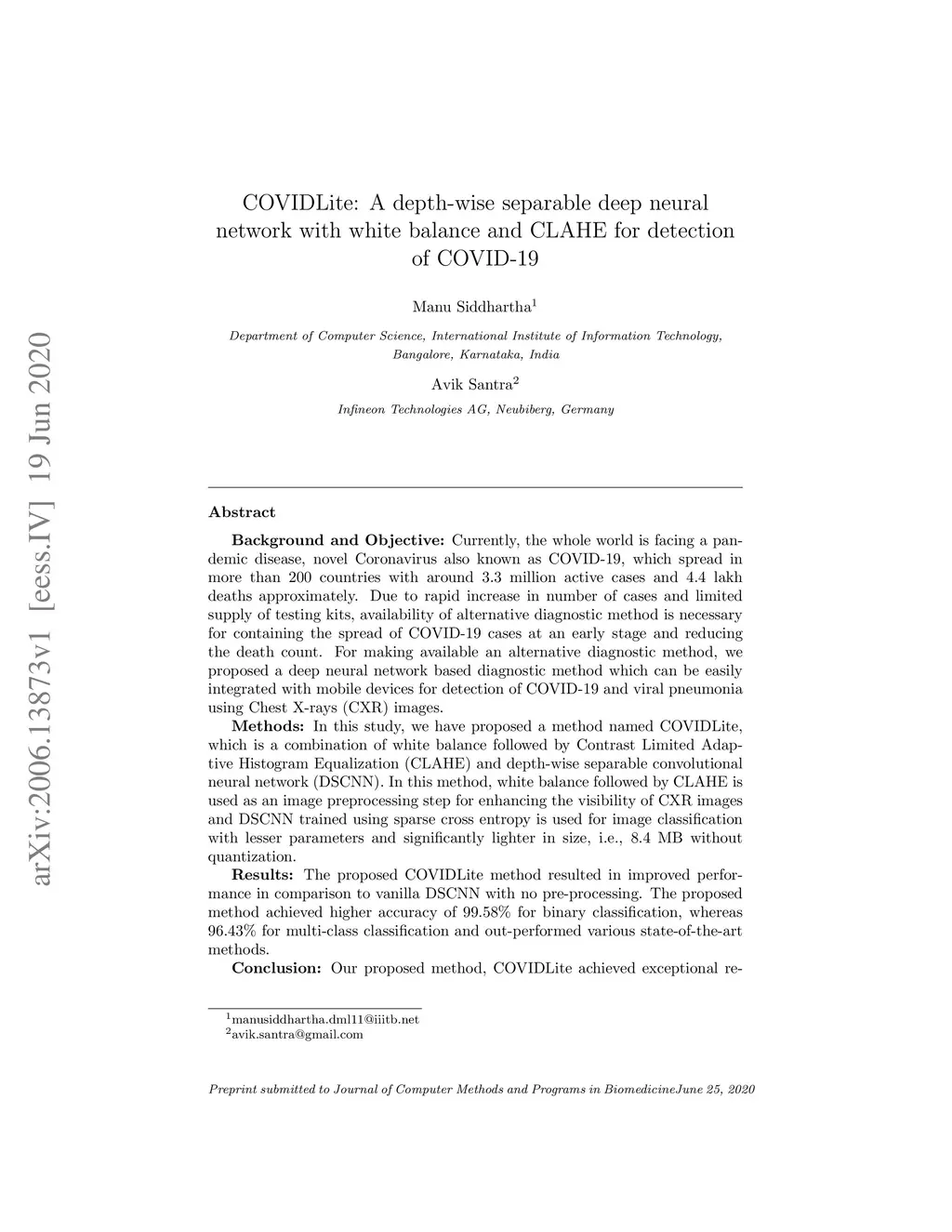 Background and Objective:Currently, the whole world is facing a pandemic disease, novel Coronavirus also known as COVID-19, which spread in more than 200 countries with around 3.3 million active cases and 4.4 lakh deaths approximately. Due to rapid increase in number of cases and limited supply of testing kits, availability of alternative diagnostic method is necessary for containing the spread of COVID-19 cases at an early stage and reducing the death count. For making available an alternative diagnostic method, we proposed a deep neural network based diagnostic method which can be easily integrated with mobile devices for detection of COVID-19 and viral pneumonia using Chest X-rays (CXR) images. Methods:In this study, we have proposed a method named COVIDLite, which is a combination of white balance followed by Contrast Limited Adaptive Histogram Equalization (CLAHE) and depth-wise separable convolutional neural network (DSCNN). In this method, white balance followed by CLAHE is used as an image preprocessing step for enhancing the visibility of CXR images and DSCNN trained using sparse cross entropy is used for image classification with lesser parameters and significantly lighter in size, i.e., 8.4 MB without quantization. Results:The proposed COVIDLite method resulted in improved performance in comparison to vanilla DSCNN with no pre-processing. The proposed method achieved higher accuracy of 99.58% for binary classification, whereas 96.43% for multiclass classification and out-performed various state-of-the-art methods. Conclusion:Our proposed method, COVIDLite achieved exceptional results on various performance metrics. With detailed model interpretations, COVIDLite can assist radiologists in detecting COVID-19 patients from CXR images and can reduce the diagnosis time significantly.