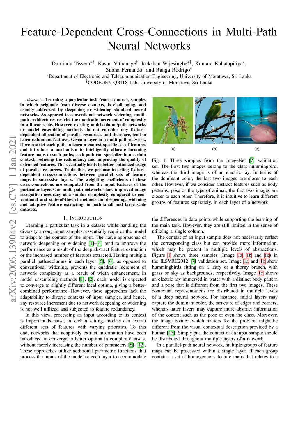 Learning a particular task from a dataset, samples in which originate from diverse contexts, is challenging, and usually addressed by deepening or widening standard neural networks. As opposed to conventional network widening, multi-path architectures restrict the quadratic increment of complexity to a linear scale. However, existing multi-column/path networks or model ensembling methods do not consider any feature-dependent allocation of parallel resources, and therefore, tend to learn redundant features. Given a layer in a multi-path network, if we restrict each path to learn a context-specific set of features and introduce a mechanism to intelligently allocate incoming feature maps to such paths, each path can specialize in a certain context, reducing the redundancy and improving the quality of extracted features. This eventually leads to better-optimized usage of parallel resources. To do this, we propose inserting feature-dependent cross-connections between parallel sets of feature maps in successive layers. The weighting coefficients of these cross-connections are computed from the input features of the particular layer. Our multi-path networks show improved image recognition accuracy at a similar complexity compared to conventional and state-of-the-art methods for deepening, widening and adaptive feature extracting, in both small and large scale datasets.
