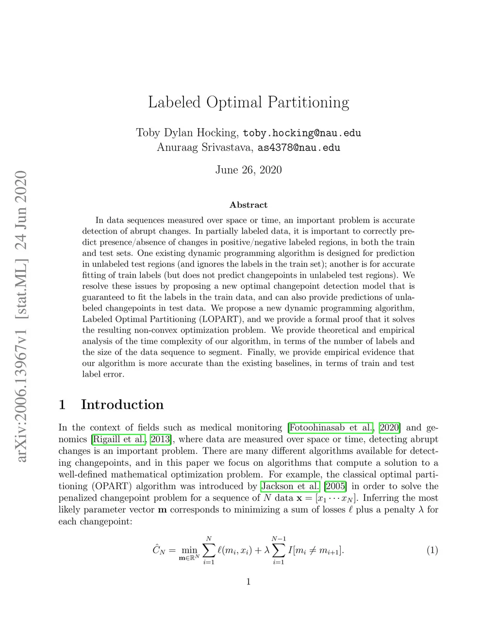 In data sequences measured over space or time, an important problem is accurate detection of abrupt changes. In partially labeled data, it is important to correctly predict presence/absence of changes in positive/negative labeled regions, in both the train and test sets. One existing dynamic programming algorithm is designed for prediction in unlabeled test regions (and ignores the labels in the train set); another is for accurate fitting of train labels (but does not predict changepoints in unlabeled test regions). We resolve these issues by proposing a new optimal changepoint detection model that is guaranteed to fit the labels in the train data, and can also provide predictions of unlabeled changepoints in test data. We propose a new dynamic programming algorithm, Labeled Optimal Partitioning (LOPART), and we provide a formal proof that it solves the resulting non-convex optimization problem. We provide theoretical and empirical analysis of the time complexity of our algorithm, in terms of the number of labels and the size of the data sequence to segment. Finally, we provide empirical evidence that our algorithm is more accurate than the existing baselines, in terms of train and test label error.