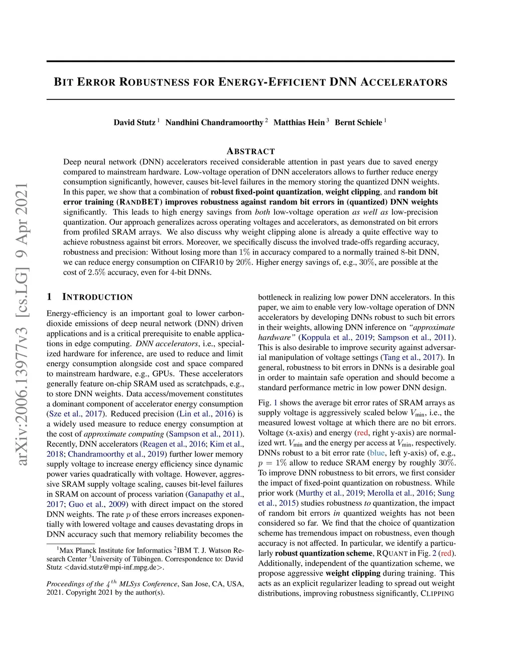 Deep neural network (DNN) accelerators received considerable attention in past years due to saved energy compared to mainstream hardware. Low-voltage operation of DNN accelerators allows to further reduce energy consumption significantly, however, causes bit-level failures in the memory storing the quantized DNN weights. In this paper, we show that a combination of robust fixed-point quantization, weight clipping, and random bit error training (RandBET) improves robustness against random bit errors in (quantized) DNN weights significantly. This leads to high energy savings from both low-voltage operation as well as low-precision quantization. Our approach generalizes across operating voltages and accelerators, as demonstrated on bit errors from profiled SRAM arrays. We also discuss why weight clipping alone is already a quite effective way to achieve robustness against bit errors. Moreover, we specifically discuss the involved trade-offs regarding accuracy, robustness and precision: Without losing more than 1% in accuracy compared to a normally trained 8-bit DNN, we can reduce energy consumption on CIFAR-10 by 20%. Higher energy savings of, e.g., 30%, are possible at the cost of 2.5% accuracy, even for 4-bit DNNs.