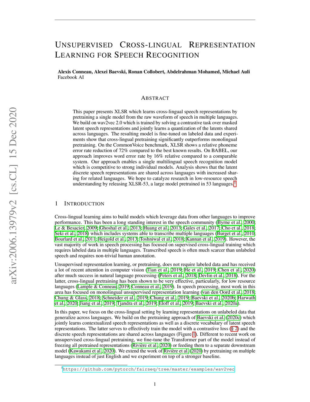 This paper presents XLSR which learns cross-lingual speech representations by pretraining a single model from the raw waveform of speech in multiple languages. We build on wav2vec 2.0 which is trained by solving a contrastive task over masked latent speech representations and jointly learns a quantization of the latents shared across languages. The resulting model is fine-tuned on labeled data and experiments show that cross-lingual pretraining significantly outperforms monolingual pretraining. On the CommonVoice benchmark, XLSR shows a relative phoneme error rate reduction of 72% compared to the best known results. On BABEL, our approach improves word error rate by 16% relative compared to a comparable system. Our approach enables a single multilingual speech recognition model which is competitive to strong individual models. Analysis shows that the latent discrete speech representations are shared across languages with increased sharing for related languages. We hope to catalyze research in low-resource speech understanding by releasing XLSR-53, a large model pretrained in 53 languages.