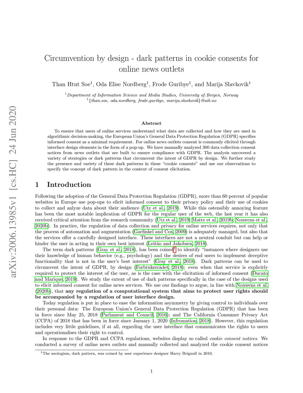 To ensure that users of online services understand what data are collected and how they are used in algorithmic decision-making, the European Union's General Data Protection Regulation (GDPR) specifies informed consent as a minimal requirement. For online news outlets consent is commonly elicited through interface design elements in the form of a pop-up. We have manually analyzed 300 data collection consent notices from news outlets that are built to ensure compliance with GDPR. The analysis uncovered a variety of strategies or dark patterns that circumvent the intent of GDPR by design. We further study the presence and variety of these dark patterns in these "cookie consents" and use our observations to specify the concept of dark pattern in the context of consent elicitation.