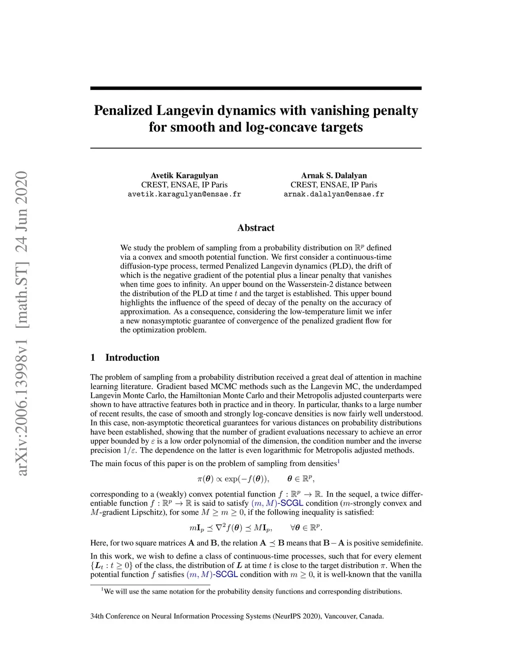 We study the problem of sampling from a probability distribution on defined via a convex and smooth potential function. We consider a continuous-time diffusion-type process, termed Penalized Langevin dynamics (PLD), the drift of which is the negative gradient of the potential plus a linear penalty that vanishes when time goes to infinity. An upper bound on the Wasserstein-2 distance between the distribution of the PLD at time and the target is established. This upper bound highlights the influence of the speed of decay of the penalty on the accuracy of the approximation. As a consequence, considering the low-temperature limit we infer a new nonasymptotic guarantee of convergence of the penalized gradient flow for the optimization problem.