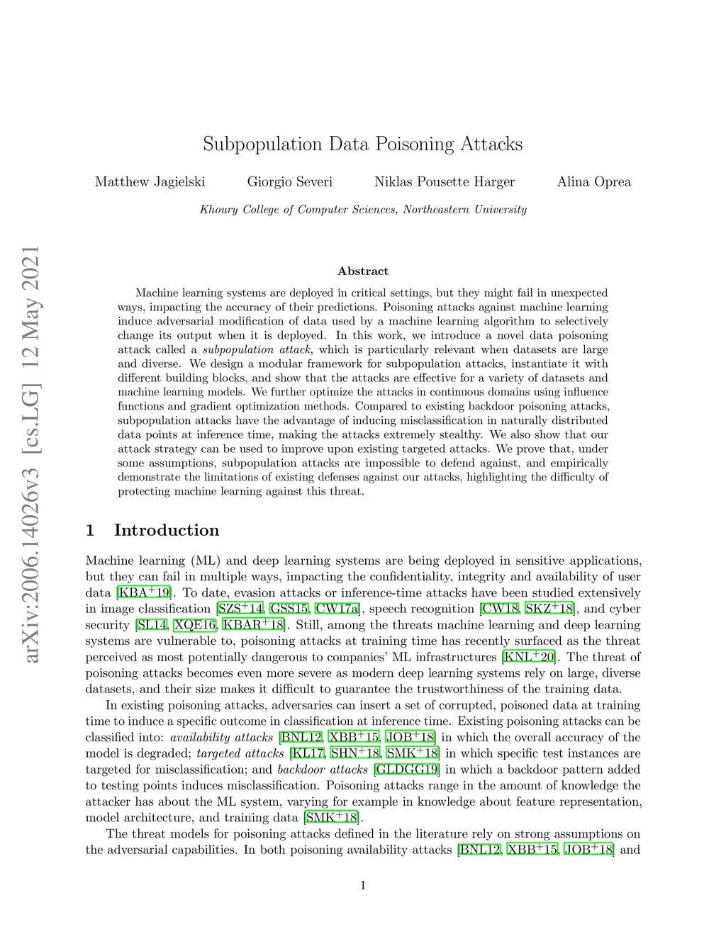 Machine learning systems are deployed in critical settings, but they might fail in unexpected ways, impacting the accuracy of their predictions. Poisoning attacks against machine learning induce adversarial modification of data used by a machine learning algorithm to selectively change its output when it is deployed. In this work, we introduce a novel data poisoning attack called a \emph{subpopulation attack}, which is particularly relevant when datasets are large and diverse. We design a modular framework for subpopulation attacks, instantiate it with different building blocks, and show that the attacks are effective for a variety of datasets and machine learning models. We further optimize the attacks in continuous domains using influence functions and gradient optimization methods. Compared to existing backdoor poisoning attacks, subpopulation attacks have the advantage of inducing misclassification in naturally distributed data points at inference time, making the attacks extremely stealthy. We also show that our attack strategy can be used to improve upon existing targeted attacks. We prove that, under some assumptions, subpopulation attacks are impossible to defend against, and empirically demonstrate the limitations of existing defenses against our attacks, highlighting the difficulty of protecting machine learning against this threat.