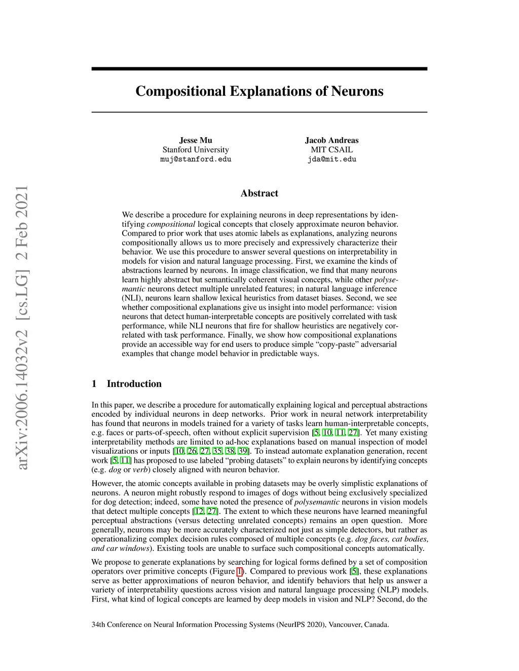 We describe a procedure for explaining neurons in deep representations by identifying compositional logical concepts that closely approximate neuron behavior. Compared to prior work that uses atomic labels as explanations, analyzing neurons compositionally allows us to more precisely and expressively characterize their behavior. We use this procedure to answer several questions on interpretability in models for vision and natural language processing. First, we examine the kinds of abstractions learned by neurons. In image classification, we find that many neurons learn highly abstract but semantically coherent visual concepts, while other polysemantic neurons detect multiple unrelated features; in natural language inference (NLI), neurons learn shallow lexical heuristics from dataset biases. Second, we see whether compositional explanations give us insight into model performance: vision neurons that detect human-interpretable concepts are positively correlated with task performance, while NLI neurons that fire for shallow heuristics are negatively correlated with task performance. Finally, we show how compositional explanations provide an accessible way for end users to produce simple "copy-paste" adversarial examples that change model behavior in predictable ways.