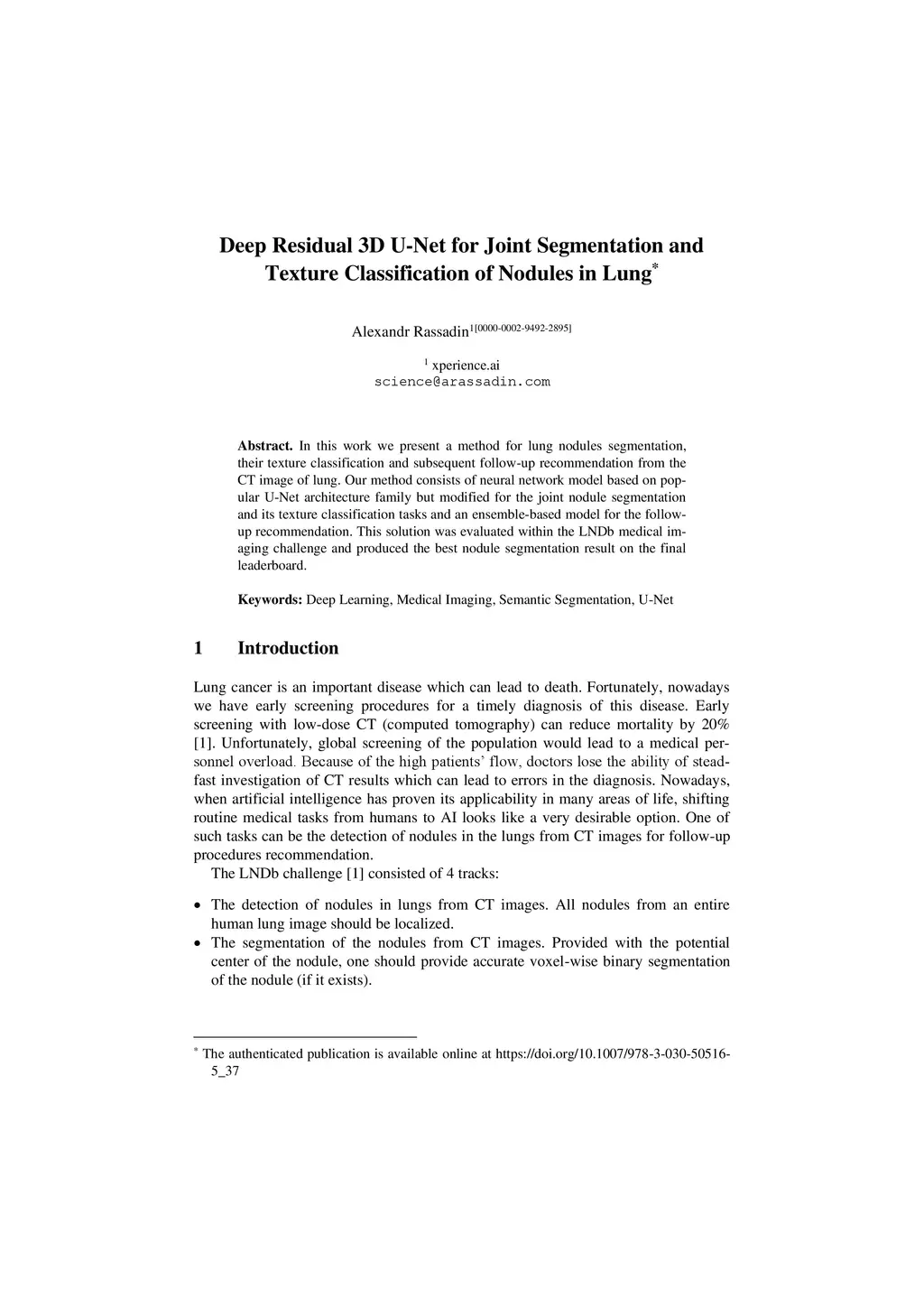 In this work we present a method for lung nodules segmentation, their texture classification and subsequent follow-up recommendation from the CT image of lung. Our method consists of neural network model based on popular U-Net architecture family but modified for the joint nodule segmentation and its texture classification tasks and an ensemble-based model for the follow-up recommendation. This solution was evaluated within the LNDb medical imaging challenge and produced the best nodule segmentation result on the final leaderboard.