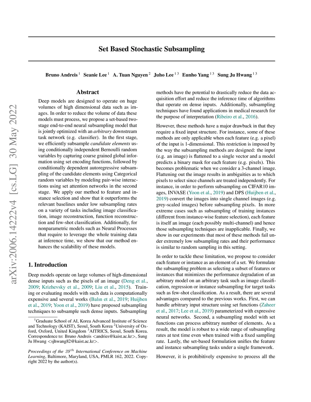 Current machine learning algorithms are designed to work with huge volumes of high dimensional data such as images. However, these algorithms are being increasingly deployed to resource constrained systems such as mobile devices and embedded systems. Even in cases where large computing infrastructure is available, the size of each data instance, as well as datasets, can provide a huge bottleneck in data transfer across communication channels. Also, there is a huge incentive both in energy and monetary terms in reducing both the computational and memory requirements of these algorithms. For non-parametric models that require to leverage the stored training data at the inference time, the increased cost in memory and computation could be even more problematic. In this work, we aim to reduce the volume of data these algorithms must process through an end-to-end two-stage neural subset selection model, where the first stage selects a set of candidate points using a conditionally independent Bernoulli mask followed by an iterative coreset selection via a conditional Categorical distribution. The subset selection model is trained by meta-learning with a distribution of sets. We validate our method on set reconstruction and classification tasks with feature selection as well as the selection of representative samples from a given dataset, on which our method outperforms relevant baselines. We also show in our experiments that our method enhances scalability of non-parametric models such as Neural Processes.