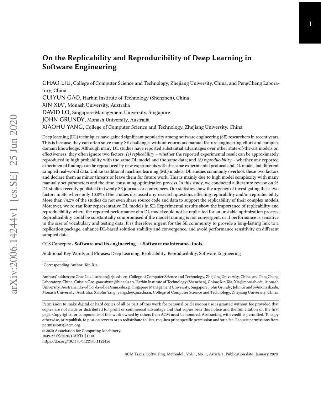 Deep learning (DL) techniques have gained significant popularity among software engineering (SE) researchers in recent years. This is because they can often solve many SE challenges without enormous manual feature engineering effort and complex domain knowledge. Although many DL studies have reported substantial advantages over other state-of-the-art models on effectiveness, they often ignore two factors: (1) replicability - whether the reported experimental result can be approximately reproduced in high probability with the same DL model and the same data; and (2) reproducibility - whether one reported experimental findings can be reproduced by new experiments with the same experimental protocol and DL model, but different sampled real-world data. Unlike traditional machine learning (ML) models, DL studies commonly overlook these two factors and declare them as minor threats or leave them for future work. This is mainly due to high model complexity with many manually set parameters and the time-consuming optimization process. In this study, we conducted a literature review on 93 DL studies recently published in twenty SE journals or conferences. Our statistics show the urgency of investigating these two factors in SE. Moreover, we re-ran four representative DL models in SE. Experimental results show the importance of replicability and reproducibility, where the reported performance of a DL model could not be replicated for an unstable optimization process. Reproducibility could be substantially compromised if the model training is not convergent, or if performance is sensitive to the size of vocabulary and testing data. It is therefore urgent for the SE community to provide a long-lasting link to a replication package, enhance DL-based solution stability and convergence, and avoid performance sensitivity on different sampled data.