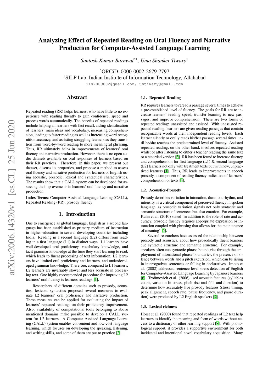 Repeated reading (RR) helps learners, who have little to no experience with reading fluently to gain confidence, speed and process words automatically. The benefits of repeated readings include helping all learners with fact recall, aiding identification of learners' main ideas and vocabulary, increasing comprehension, leading to faster reading as well as increasing word recognition accuracy, and assisting struggling learners as they transition from word-by-word reading to more meaningful phrasing. Thus, RR ultimately helps in improvements of learners' oral fluency and narrative production. However, there are no open audio datasets available on oral responses of learners based on their RR practices. Therefore, in this paper, we present our dataset, discuss its properties, and propose a method to assess oral fluency and narrative production for learners of English using acoustic, prosodic, lexical and syntactical characteristics. The results show that a CALL system can be developed for assessing the improvements in learners' oral fluency and narrative production.