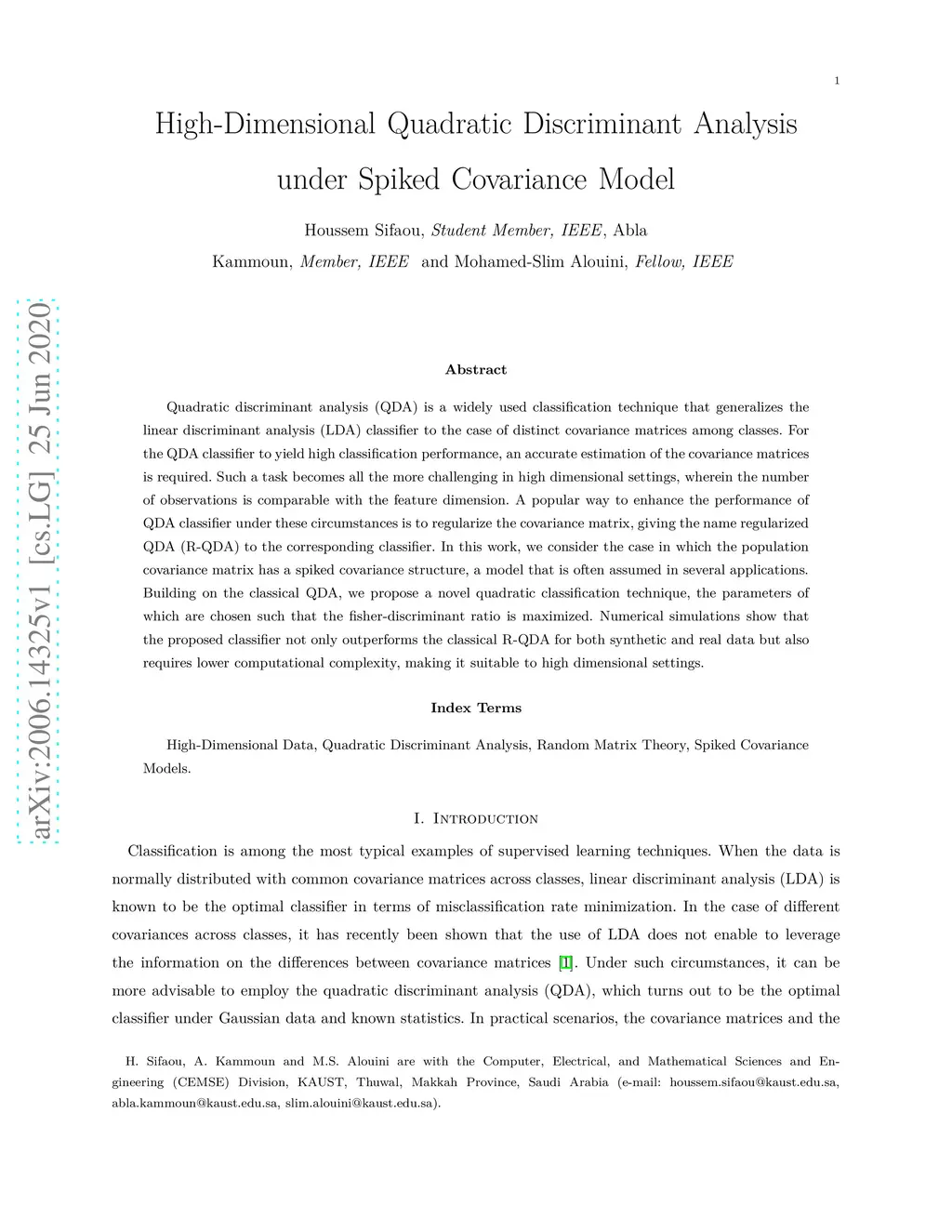 Quadratic discriminant analysis (QDA) is a widely used classification technique that generalizes the linear discriminant analysis (LDA) classifier to the case of distinct covariance matrices among classes. For the QDA classifier to yield high classification performance, an accurate estimation of the covariance matrices is required. Such a task becomes all the more challenging in high dimensional settings, wherein the number of observations is comparable with the feature dimension. A popular way to enhance the performance of QDA classifier under these circumstances is to regularize the covariance matrix, giving the name regularized QDA (R-QDA) to the corresponding classifier. In this work, we consider the case in which the population covariance matrix has a spiked covariance structure, a model that is often assumed in several applications. Building on the classical QDA, we propose a novel quadratic classification technique, the parameters of which are chosen such that the fisher-discriminant ratio is maximized. Numerical simulations show that the proposed classifier not only outperforms the classical R-QDA for both synthetic and real data but also requires lower computational complexity, making it suitable to high dimensional settings.