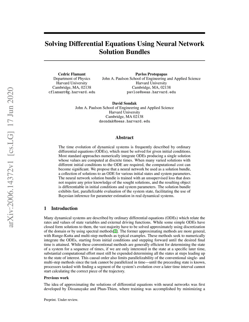 The time evolution of dynamical systems is frequently described by ordinary differential equations (ODEs), which must be solved for given initial conditions. Most standard approaches numerically integrate ODEs producing a single solution whose values are computed at discrete times. When many varied solutions with different initial conditions to the ODE are required, the computational cost can become significant. We propose that a neural network be used as a solution bundle, a collection of solutions to an ODE for various initial states and system parameters. The neural network solution bundle is trained with an unsupervised loss that does not require any prior knowledge of the sought solutions, and the resulting object is differentiable in initial conditions and system parameters. The solution bundle exhibits fast, parallelizable evaluation of the system state, facilitating the use of Bayesian inference for parameter estimation in real dynamical systems.