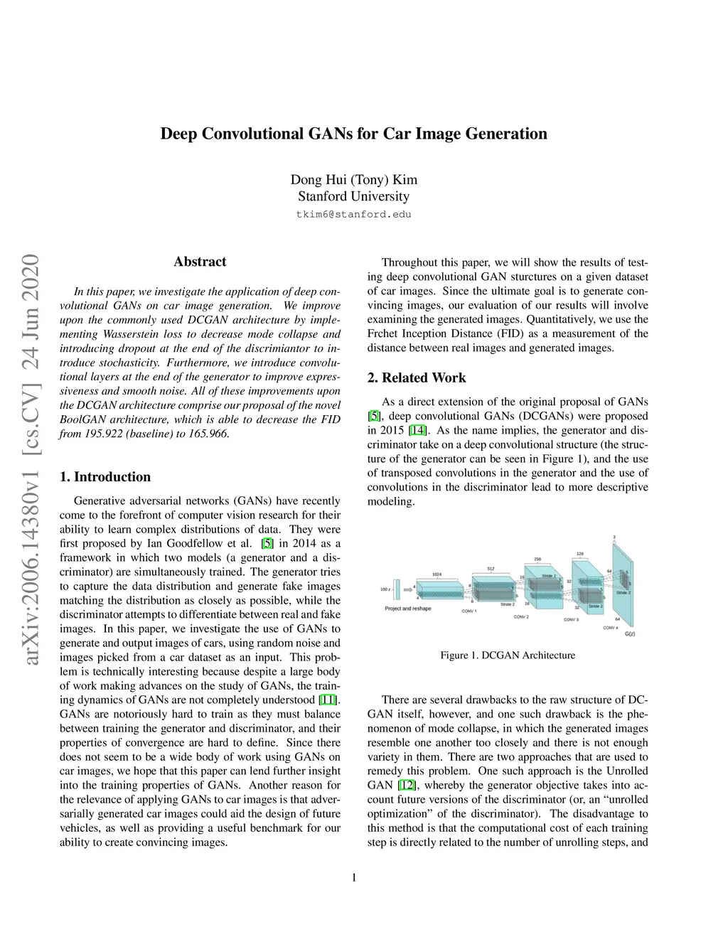 In this paper, we investigate the application of deep convolutional GANs on car image generation. We improve upon the commonly used DCGAN architecture by implementing Wasserstein loss to decrease mode collapse and introducing dropout at the end of the discrimiantor to introduce stochasticity. Furthermore, we introduce convolutional layers at the end of the generator to improve expressiveness and smooth noise. All of these improvements upon the DCGAN architecture comprise our proposal of the novel BoolGAN architecture, which is able to decrease the FID from 195.922 (baseline) to 165.966.