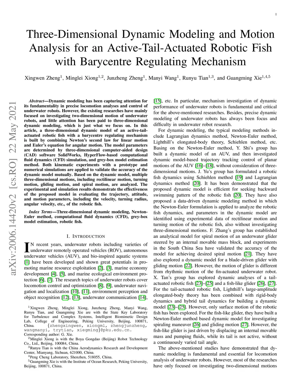 Dynamic modeling has been capturing attention for its fundamentality in precise locomotion analyses and control of underwater robots. However, the existing researches have mainly focused on investigating two-dimensional motion of underwater robots, and little attention has been paid to three-dimensional dynamic modeling, which is just what we focus on. In this article, a three-dimensional dynamic model of an active-tail-actuated robotic fish with a barycentre regulating mechanism is built by combining Newton's second law for linear motion and Euler's equation for angular motion. The model parameters are determined by three-dimensional computer-aided design (CAD) software SolidWorks, HyperFlow-based computational fluid dynamics (CFD) simulation, and grey-box model estimation method. Both kinematic experiments with a prototype and numerical simulations are applied to validate the accuracy of the dynamic model mutually. Based on the dynamic model, multiple three-dimensional motions, including rectilinear motion, turning motion, gliding motion, and spiral motion, are analyzed. The experimental and simulation results demonstrate the effectiveness of the proposed model in evaluating the trajectory, attitude, and motion parameters, including the velocity, turning radius, angular velocity, etc., of the robotic fish.