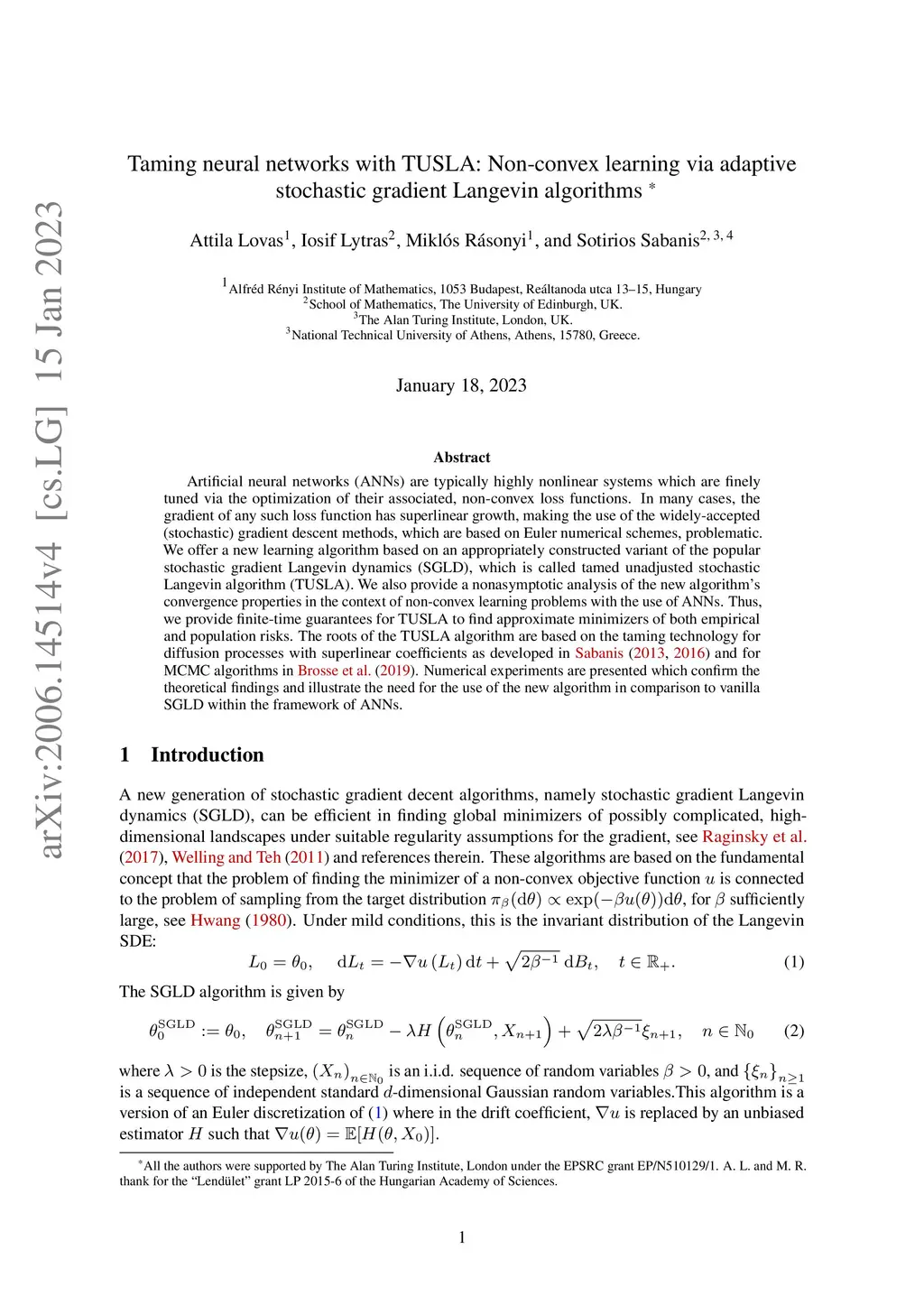 Artificial neural networks (ANNs) are typically highly nonlinear systems which are finely tuned via the optimization of their associated, non-convex loss functions. In many cases, the gradient of any such loss function has superlinear growth, making the use of the widely-accepted (stochastic) gradient descent methods, which are based on Euler numerical schemes, problematic. We offer a new learning algorithm based on an appropriately constructed variant of the popular stochastic gradient Langevin dynamics (SGLD), which is called tamed unadjusted stochastic Langevin algorithm (TUSLA). We also provide a nonasymptotic analysis of the new algorithm's convergence properties in the context of non-convex learning problems with the use of ANNs. Thus, we provide finite-time guarantees for TUSLA to find approximate minimizers of both empirical and population risks. The roots of the TUSLA algorithm are based on the taming technology for diffusion processes with superlinear coefficients as developed in \citet{tamed-euler, SabanisAoAP} and for MCMC algorithms in \citet{tula}. Numerical experiments are presented which confirm the theoretical findings and illustrate the need for the use of the new algorithm in comparison to vanilla SGLD within the framework of ANNs.