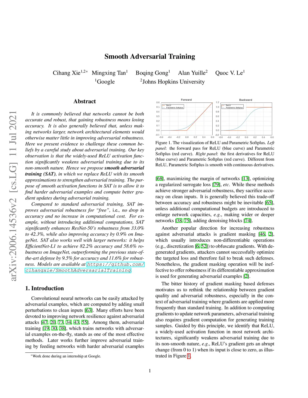 It is commonly believed that networks cannot be both accurate and robust, that gaining robustness means losing accuracy. It is also generally believed that, unless making networks larger, network architectural elements would otherwise matter little in improving adversarial robustness. Here we present evidence to challenge these common beliefs by a careful study about adversarial training. Our key observation is that the widely-used ReLU activation function significantly weakens adversarial training due to its non-smooth nature. Hence we propose smooth adversarial training (SAT), in which we replace ReLU with its smooth approximations to strengthen adversarial training. The purpose of smooth activation functions in SAT is to allow it to find harder adversarial examples and compute better gradient updates during adversarial training. Compared to standard adversarial training, SAT improves adversarial robustness for "free", i.e., no drop in accuracy and no increase in computational cost. For example, without introducing additional computations, SAT significantly enhances ResNet-50's robustness from 33.0% to 42.3%, while also improving accuracy by 0.9% on ImageNet. SAT also works well with larger networks: it helps EfficientNet-L1 to achieve 82.2% accuracy and 58.6% robustness on ImageNet, outperforming the previous state-of-the-art defense by 9.5% for accuracy and 11.6% for robustness. Models are available at https://github.com/cihangxie/SmoothAdversarialTraining.