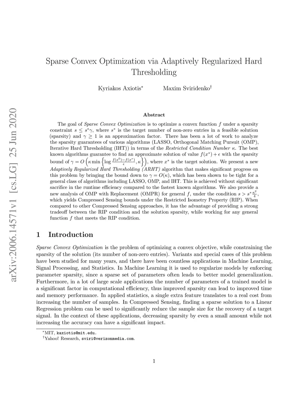 The goal of Sparse Convex Optimization is to optimize a convex function under a sparsity constraint , where is the target number of non-zero entries in a feasible solution (sparsity) and is an approximation factor. There has been a lot of work to analyze the sparsity guarantees of various algorithms (LASSO, Orthogonal Matching Pursuit (OMP), Iterative Hard Thresholding (IHT)) in terms of the Restricted Condition Number . The best known algorithms guarantee to find an approximate solution of value with the sparsity bound of , where is the target solution. We present a new Adaptively Regularized Hard Thresholding (ARHT) algorithm that makes significant progress on this problem by bringing the bound down to , which has been shown to be tight for a general class of algorithms including LASSO, OMP, and IHT. This is achieved without significant sacrifice in the runtime efficiency compared to the fastest known algorithms. We also provide a new analysis of OMP with Replacement (OMPR) for general , under the condition , which yields Compressed Sensing bounds under the Restricted Isometry Property (RIP). When compared to other Compressed Sensing approaches, it has the advantage of providing a strong tradeoff between the RIP condition and the solution sparsity, while working for any general function that meets the RIP condition.